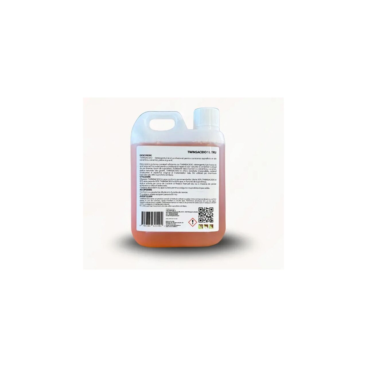 Avertizari produs:TWINSACIDO este un produs coroziv si trebuie utilizat cu grija. Evita contactul direct cu ochii si pielea. In caz de contact, spala imediat cu multa apa. Pastreaza produsul intr-un loc sigur, departe de accesul copiilor. Utilizeaza manusi si masca de protectie adecvate in timpul utilizarii pentru a asigura o manipulare sigura.