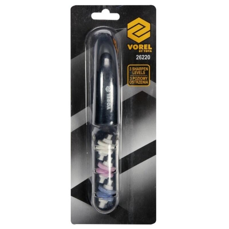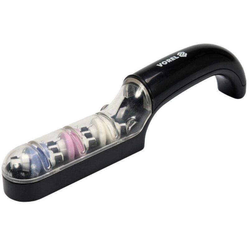 Un ascuțitor cu trei discuri duble de diferite durități concepute pentru ascuțirea eficientă a cuțitelor și a altor unelte similare. Corpul este realizat din material rezistent la deteriorare și servește și ca rezervor de apă. Discurile abrazive funcționează „ umede”, crescând eficiența ascuțirii.