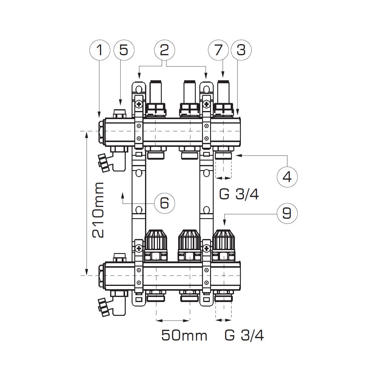 Include 2 robineți de golire și un ventil de scurgere pivotant G1/2xG3/4; circuitele folosesc nipluri G3/4, iar bara este de 1”.