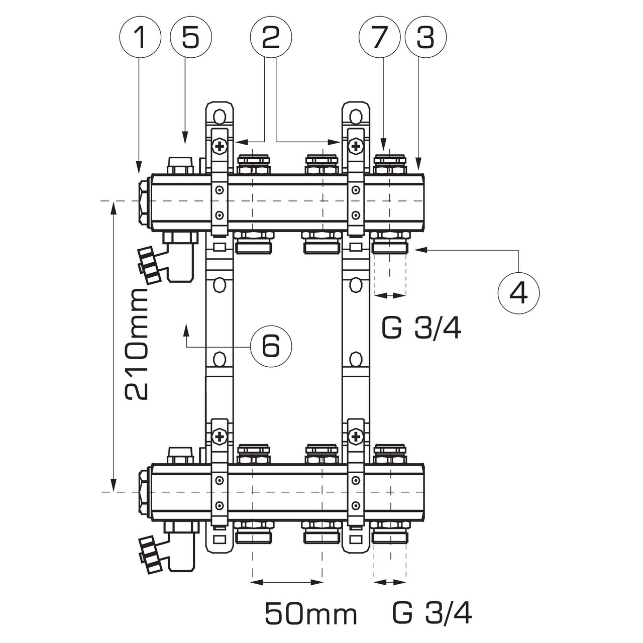 Ventilul de scurgere este pivotant G1/2xG3/4, iar circuitele folosesc niplu tip G3/4, cu 7 ieșiri de 3/4".