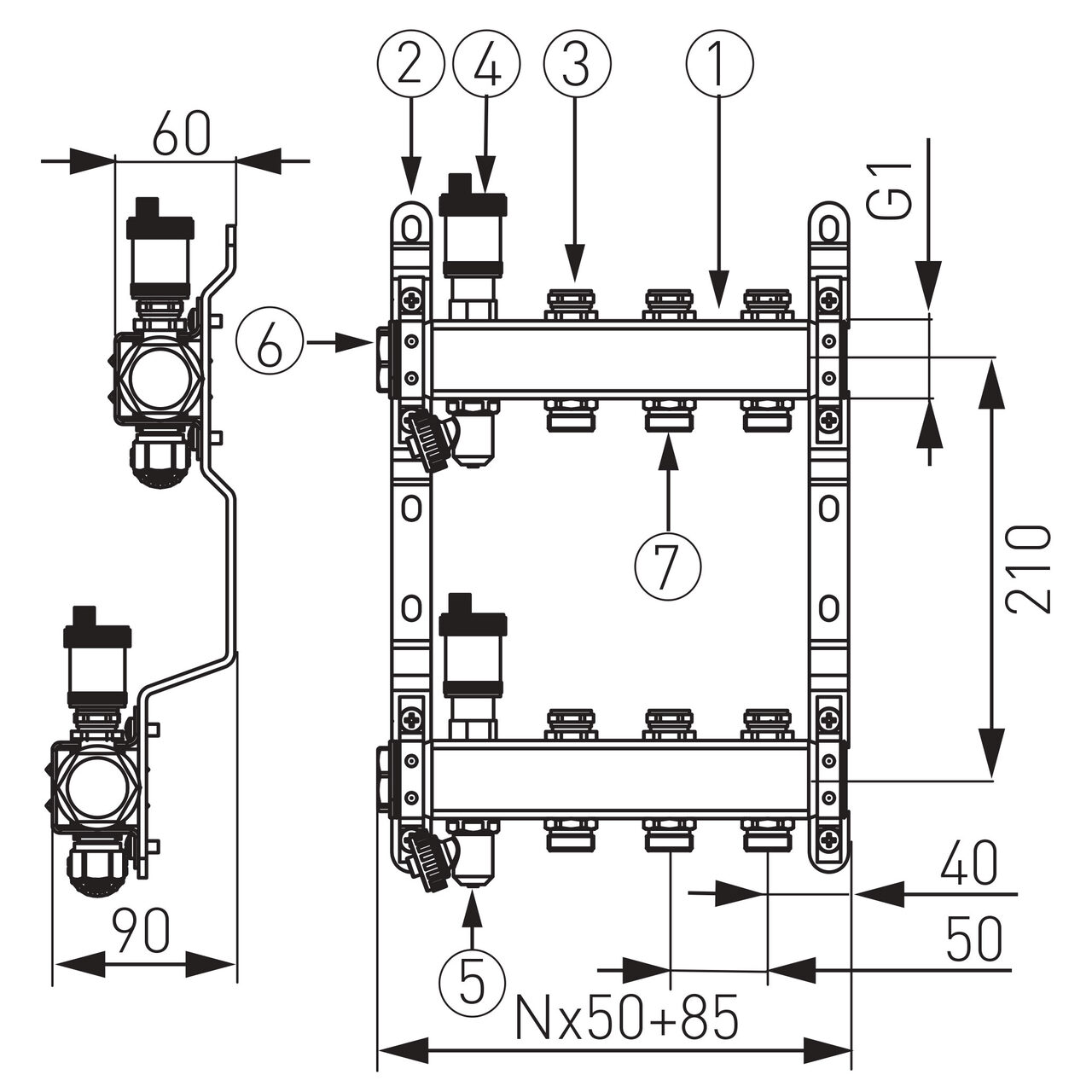 Bara principală este de 1", circuitele se cuplează prin nipluri G3/4, iar ventilul de scurgere este pivotant G1/2xG3/4.