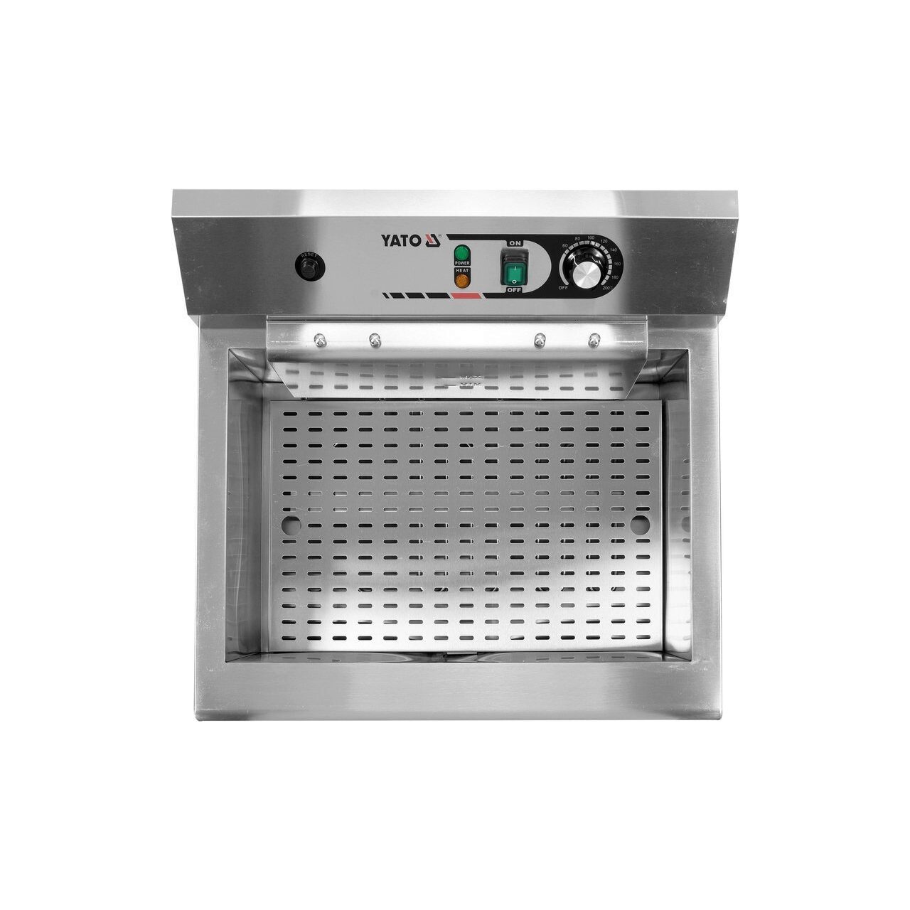 Încălzitorul de 6,0kW este controlat de un potențiometru situat pe panoul de control. Este posibil să setați temperatura de funcționare în intervalul 60 ~ 200 ℃ . Comutatorul instalat împotriva stropirii permite oprirea dispozitivului fără a deconecta cablul de alimentare de la rețea. Încălzitorul detașabil poate fi agățat pe un suport special într-o poziție în care uleiul care picură se întoarce în rezervor . Friteuza are un dispozitiv suplimentar de siguranță care oprește automat încălzitorul atunci când este scos din rezervor. O protecție suplimentară îl protejează de supraîncălzire la temperaturi peste 260 ℃ .