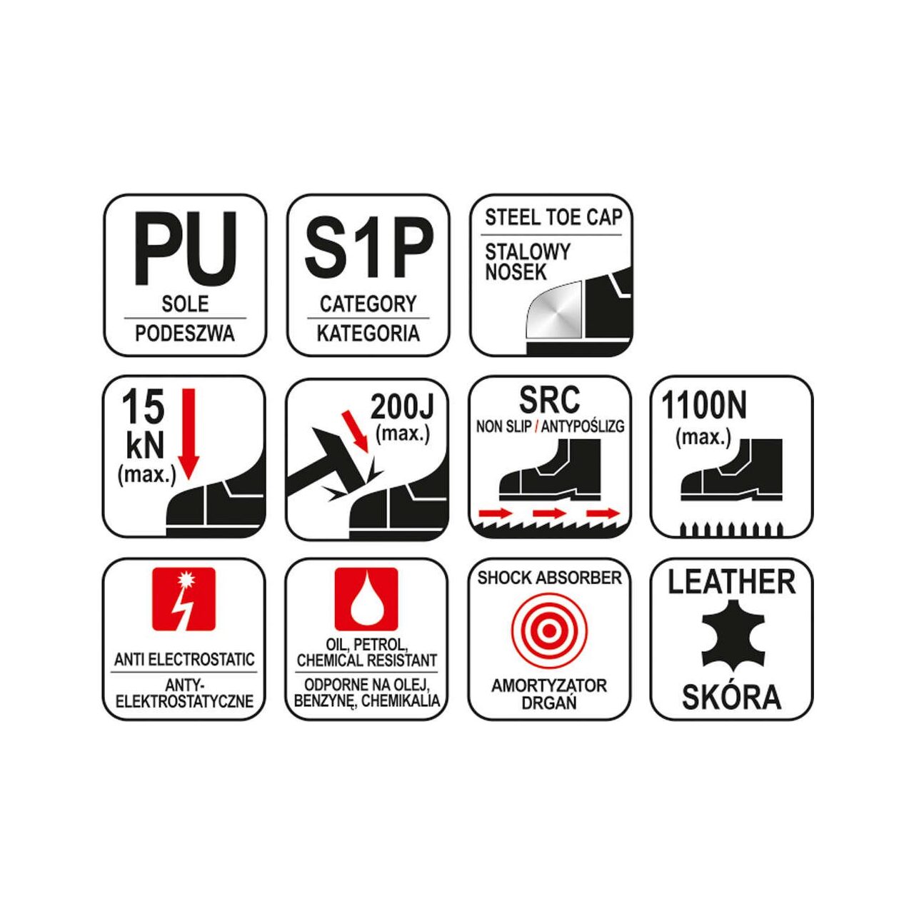 Caracteristici produs- culoare neagra - bocanci, din piele de căprioară naturala - Talpa din poliuretan, rezistent la ulei, anti-electrostatic, anti-alunecare, absorbție de șoc sub călcâiul - inserție anti-puncție protejează piciorul împotriva străpungere prin elemente aspre din partea sol cu o forță de până la 1100 N - vârf de oțel rezistent la impacturi cu o energie de 200 J și îndoire până la 15 kN - categoria de protecție S1P, îndeplinesc cerințele EN20345Domenii utilizarePentru a proteja piciorul și piciorul împotriva deteriorărilor mecanice sau chimice și a efectelor nocive ale căldurii, frigului sau umezelii.Parametrii- Numele seriei: TENDA