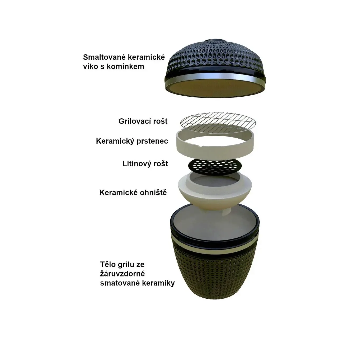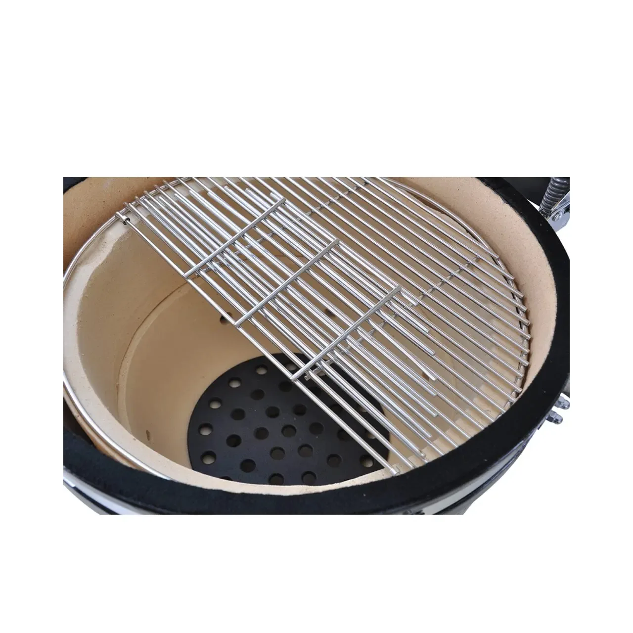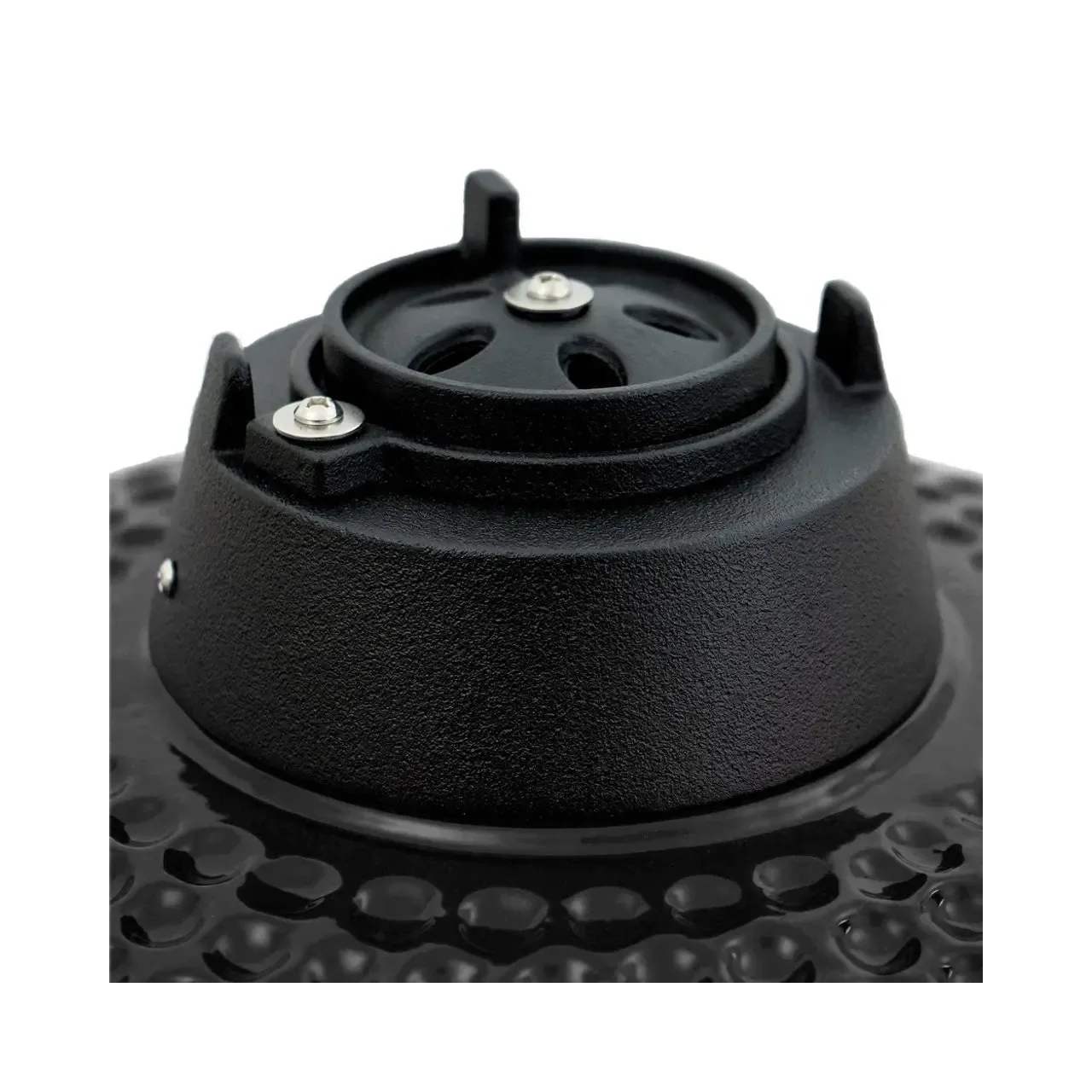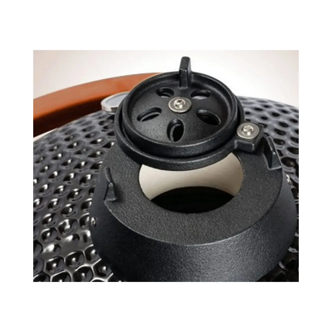 Desigur, un grătar atât de masiv cântărește ceva, așa că este echipat cu roți pentru o manevrare ușoară. Capacul ceramic cu horn din fonta este montat pe o balama cu arc pentru deschidere si inchidere usoara.
