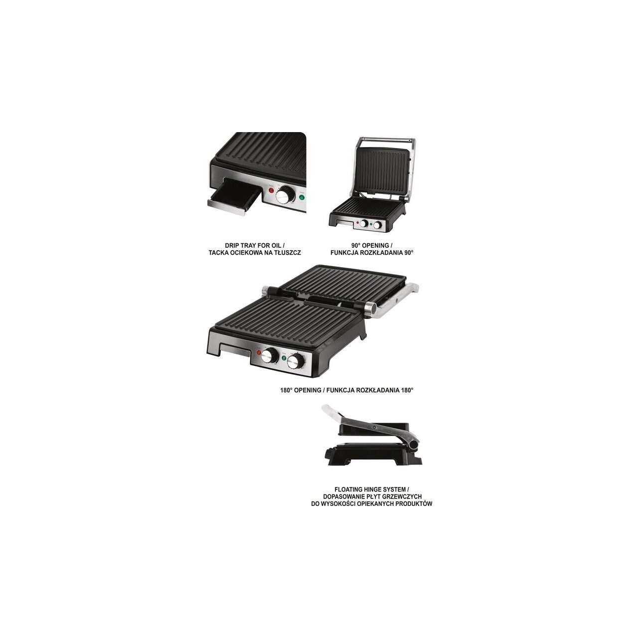 - 3 opțiuni de grătar - grătar pliat, grătar desfăcut la 90°, grătar desfăcut la 180°