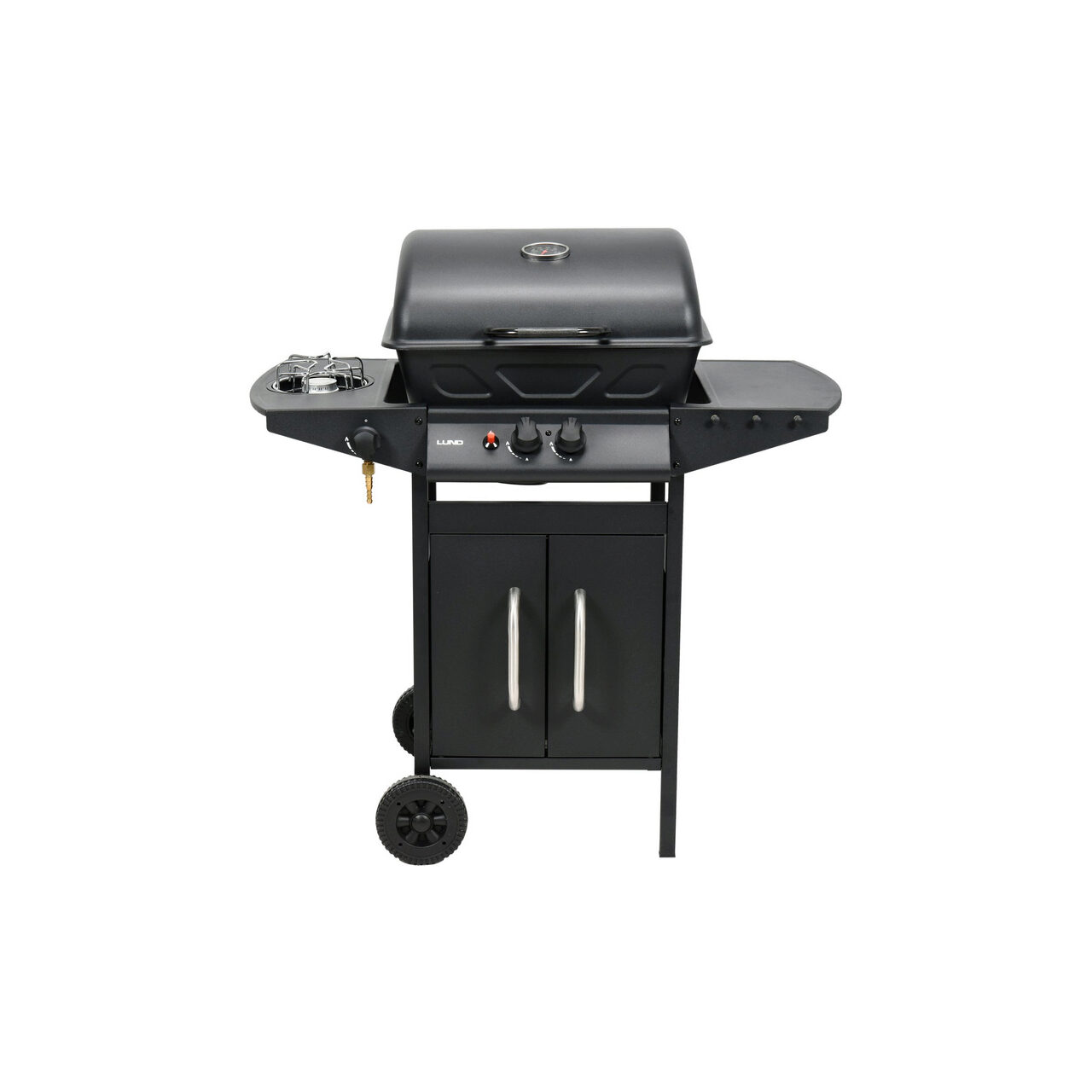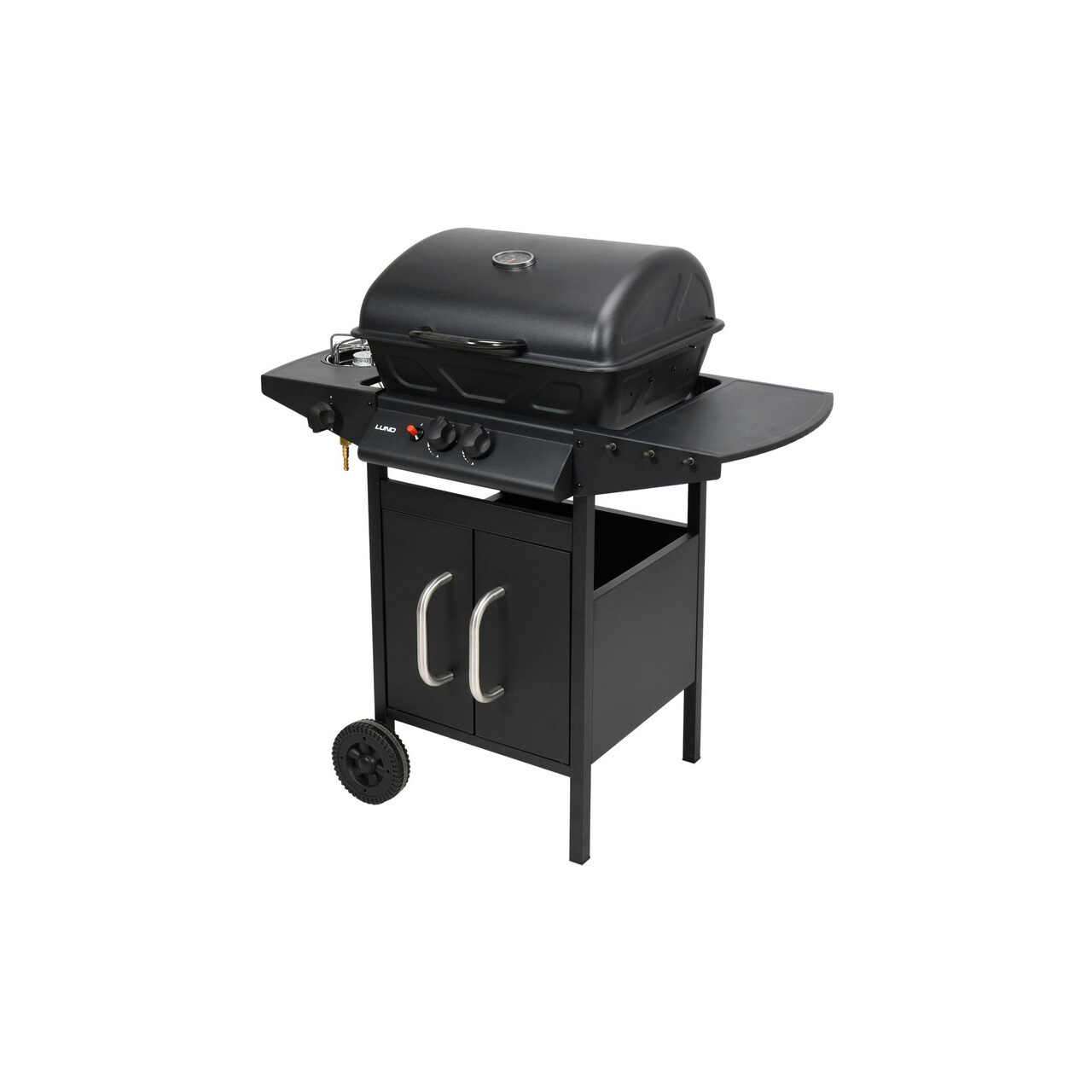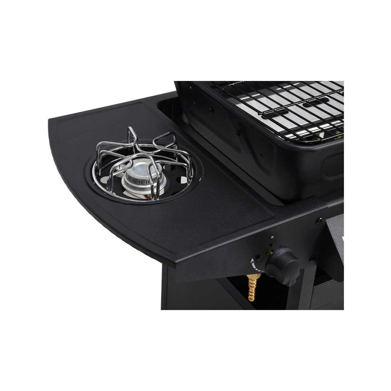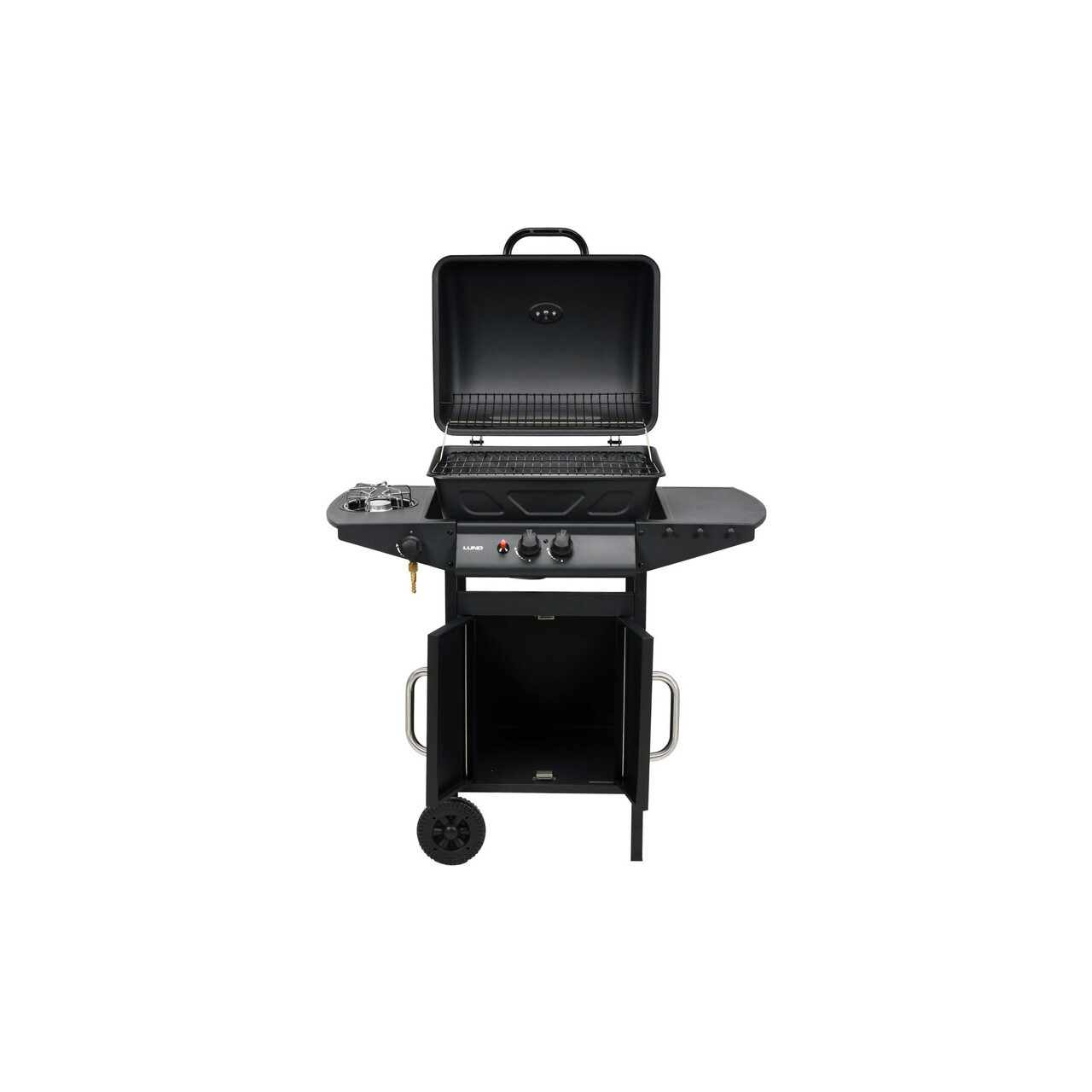 Echipat cu aprindere piezo, un arzător lateral pentru încălzirea alimentelor și un raft și un dulap pentru accesoriile necesare pentru grătar.