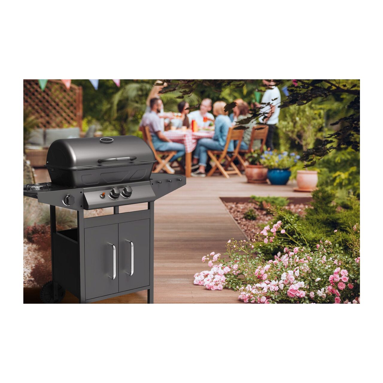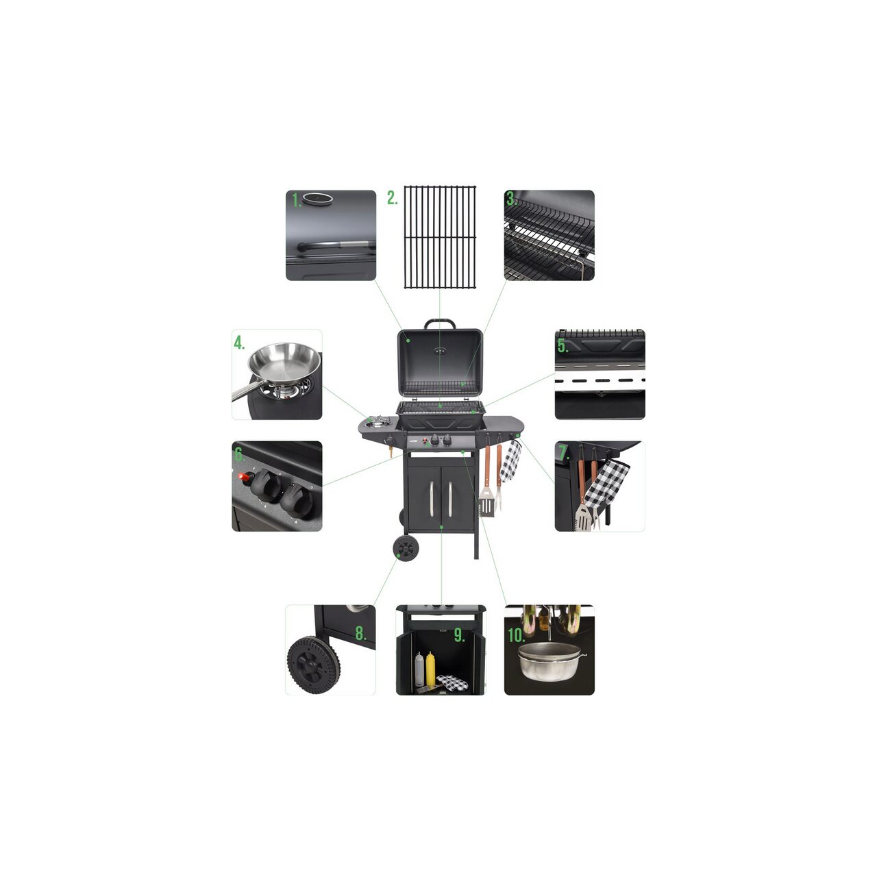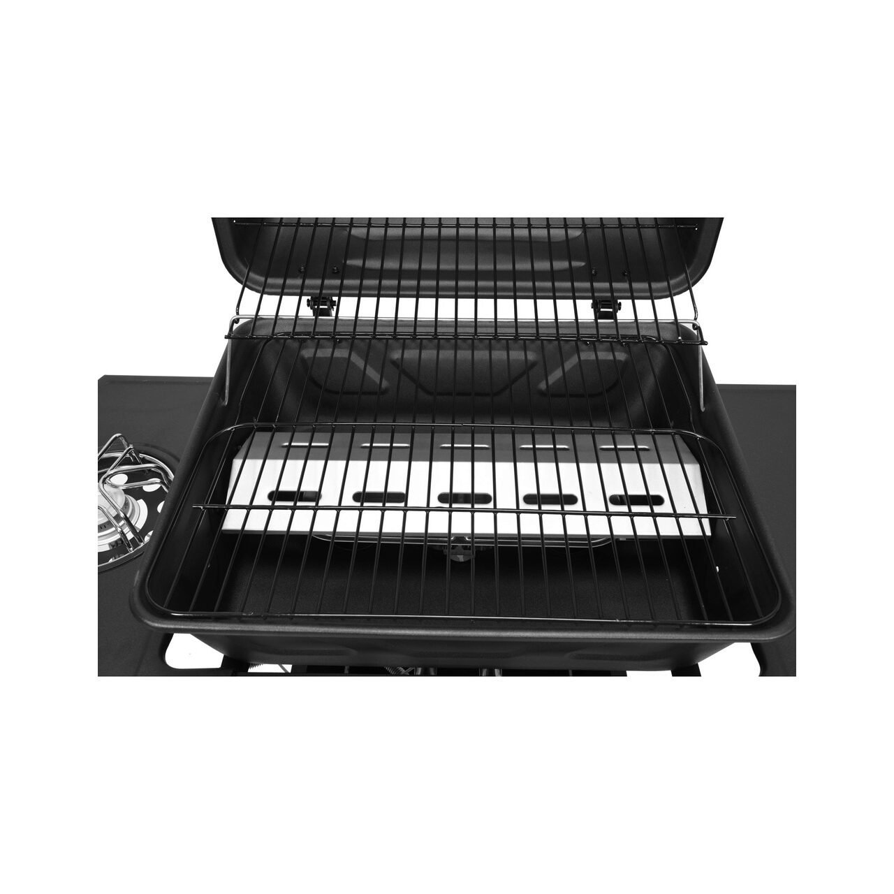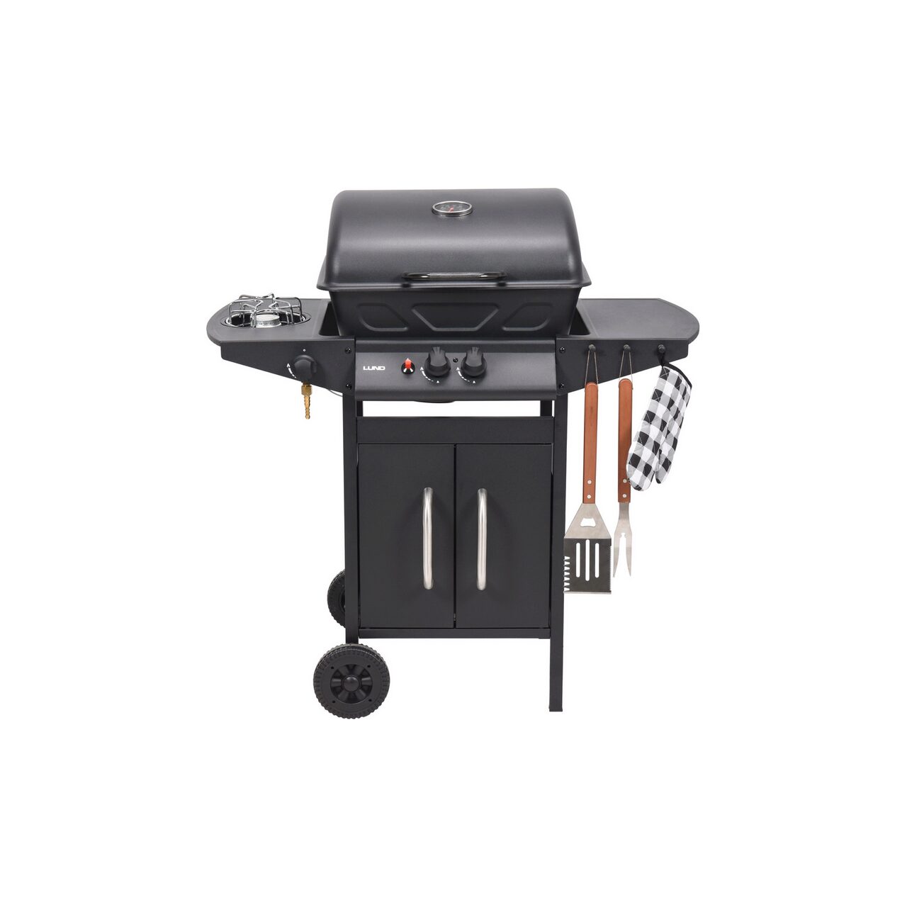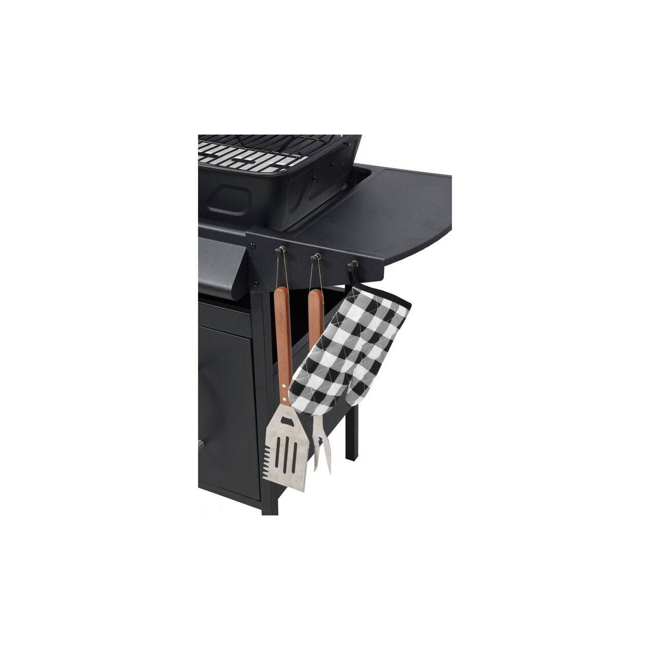 Echipat cu aprindere piezo, un arzător lateral pentru încălzirea alimentelor și un raft și un dulap pentru accesoriile necesare pentru grătar.