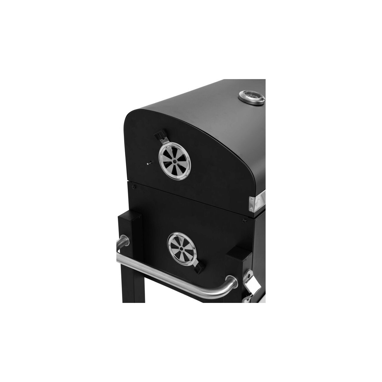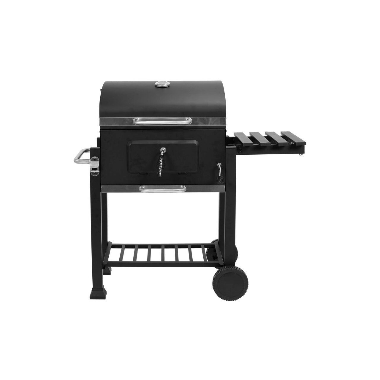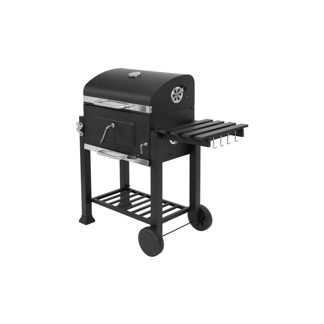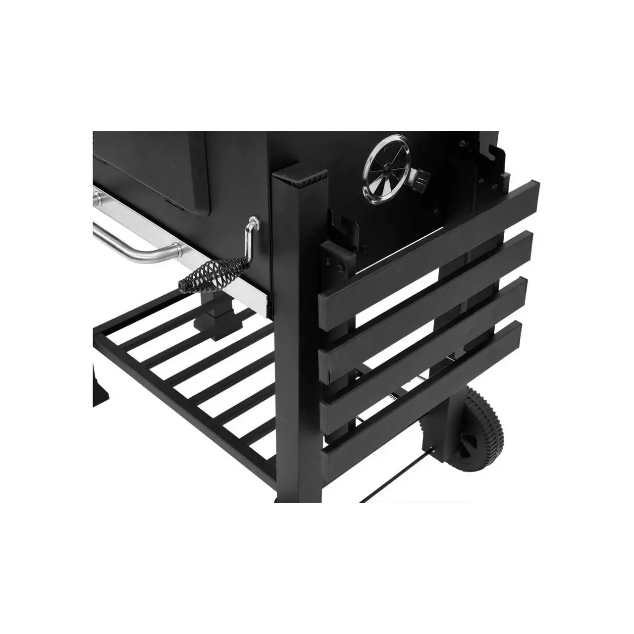 Un grătar de grădină de înaltă clasă pentru pregătirea mâncării în aer liber, cu o înălțime reglabilă a plăcii de cărbune și un termometru.