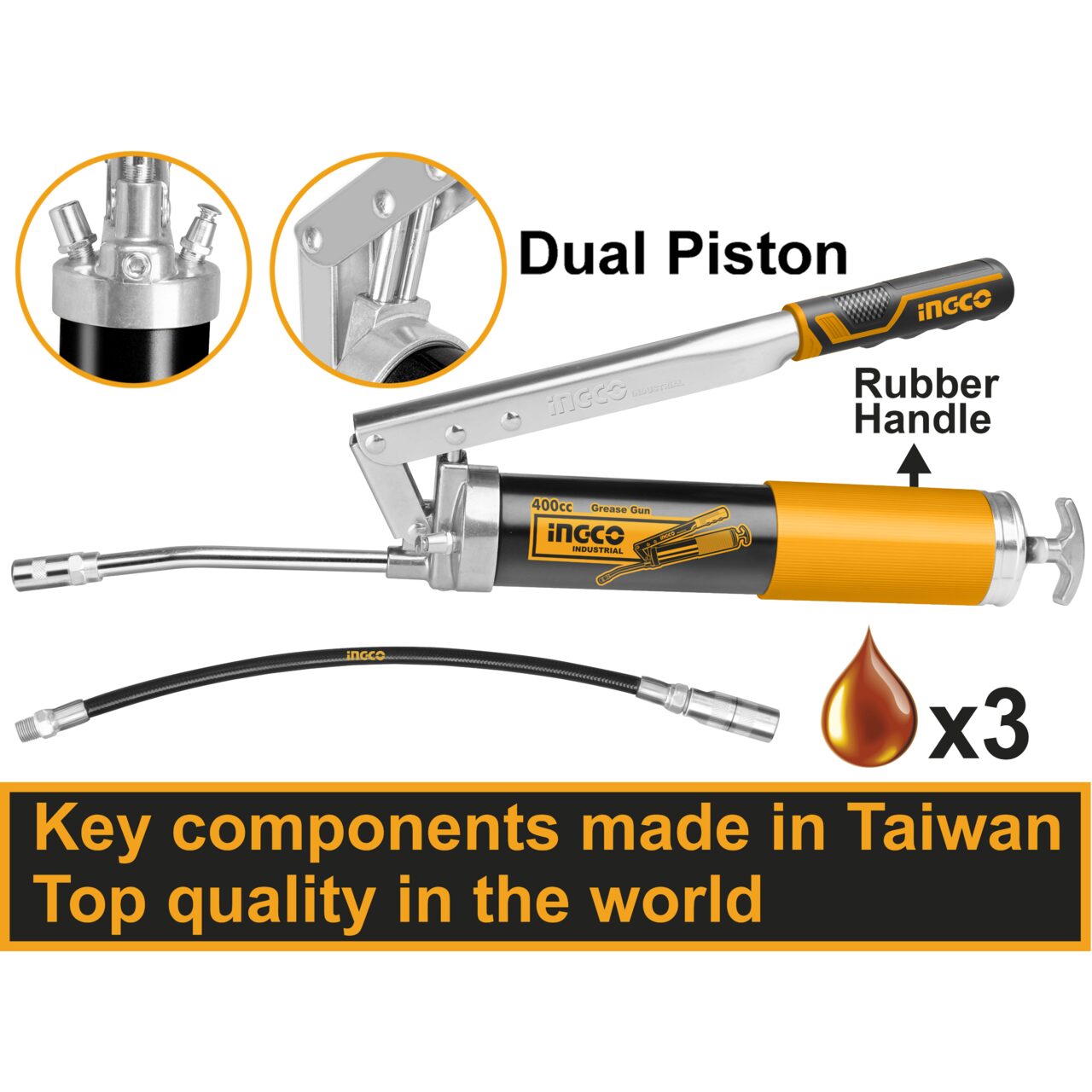 Etansarea pistoanelor rezistenta la grasime si ulei;Supapa pentru umplerea si indepartarea aerului;Ergonomic si sigur;Anti-alunecare banda de cauciuc pe corp si maner in stil INGCO imbracat in cauciuc pentru utilizare confortabila.