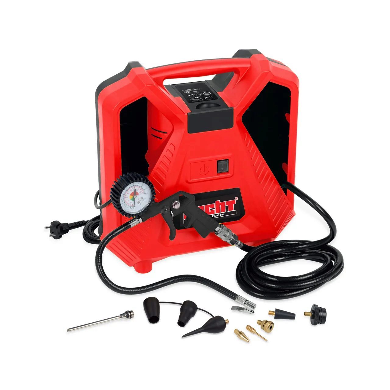 Compresorul include un pistol de aer cu furtun și manometru pentru a vă oferi o livrare de aer precisă și fiabilă. În plus, primiți și un set de adaptoare care vă permit să folosiți compresorul în diferite scopuri.