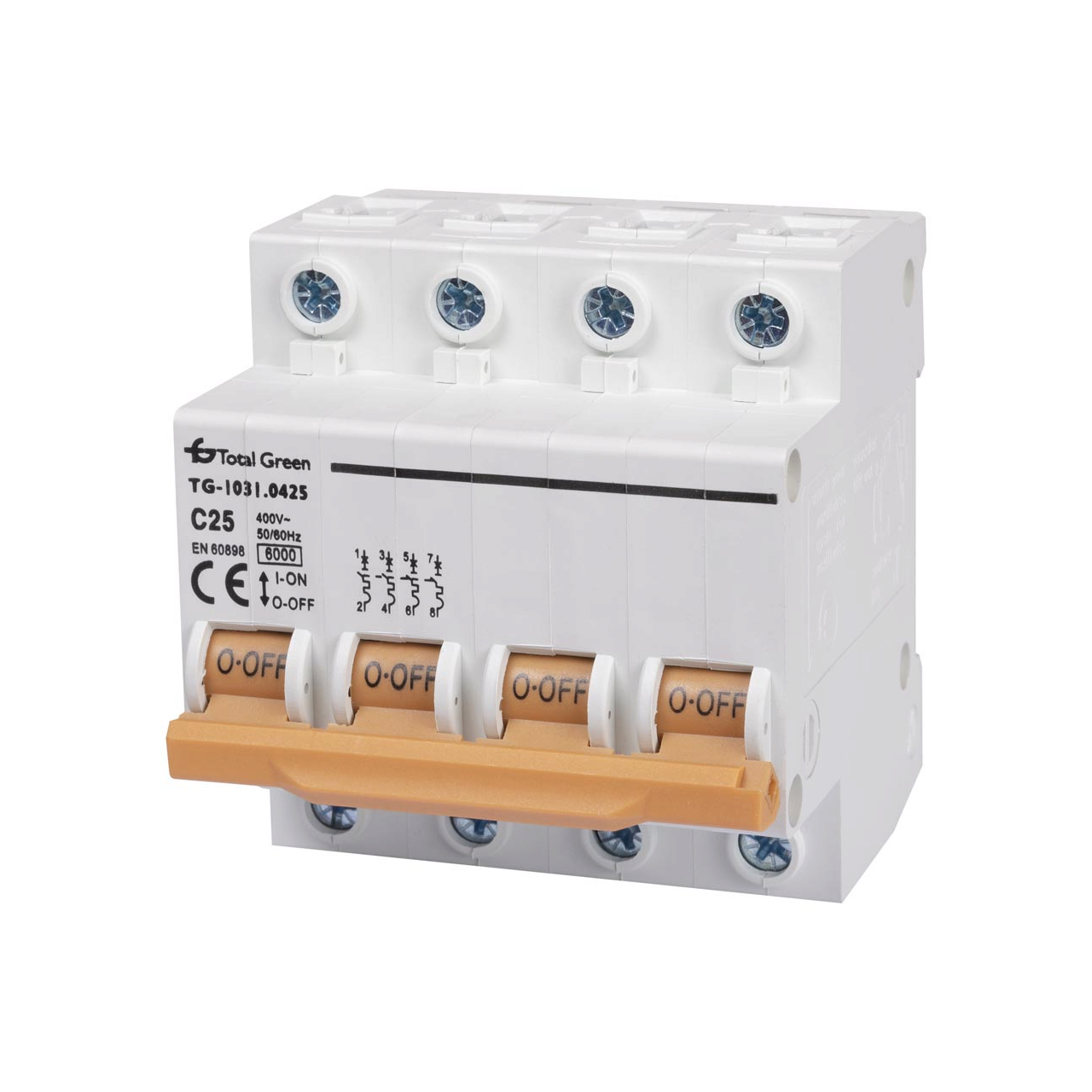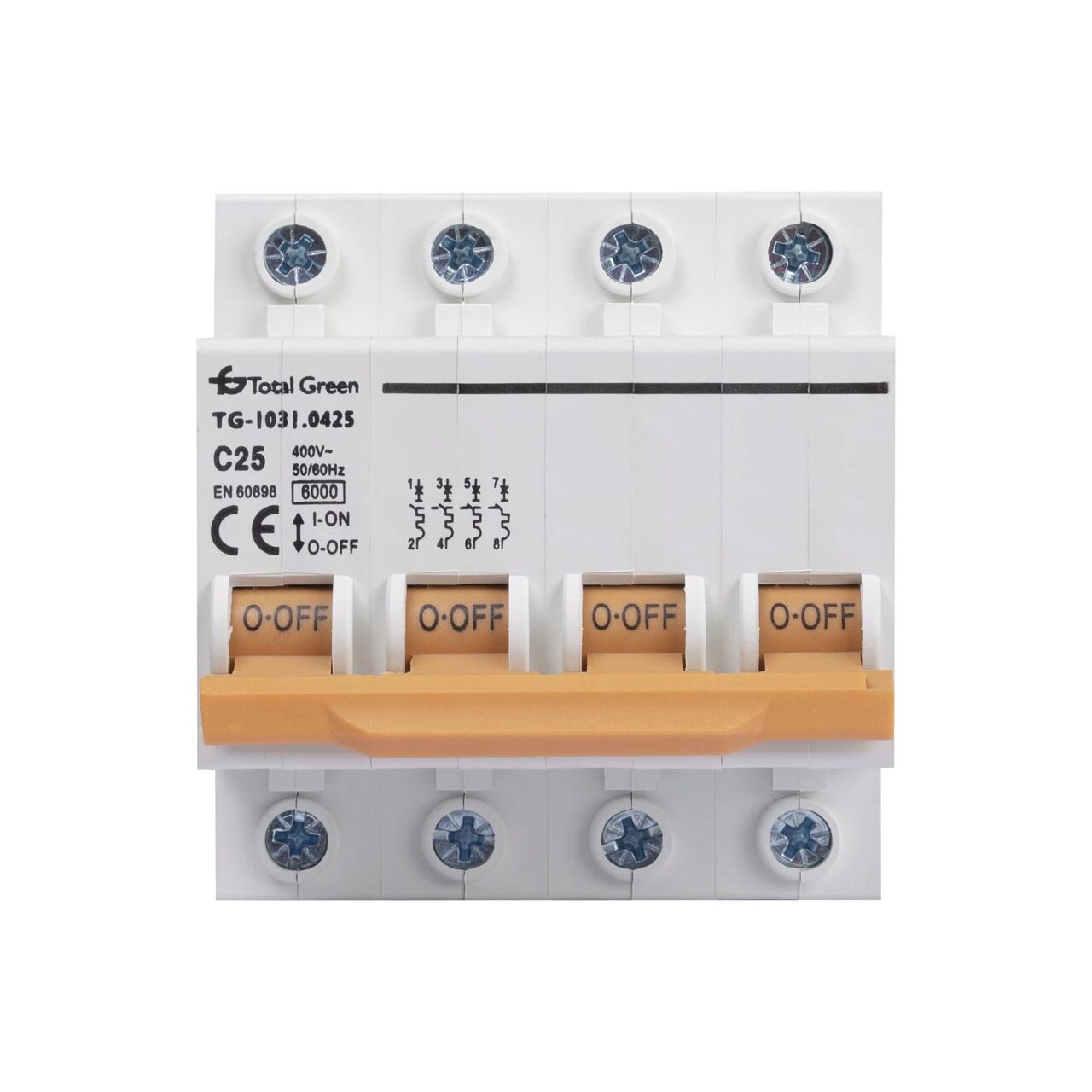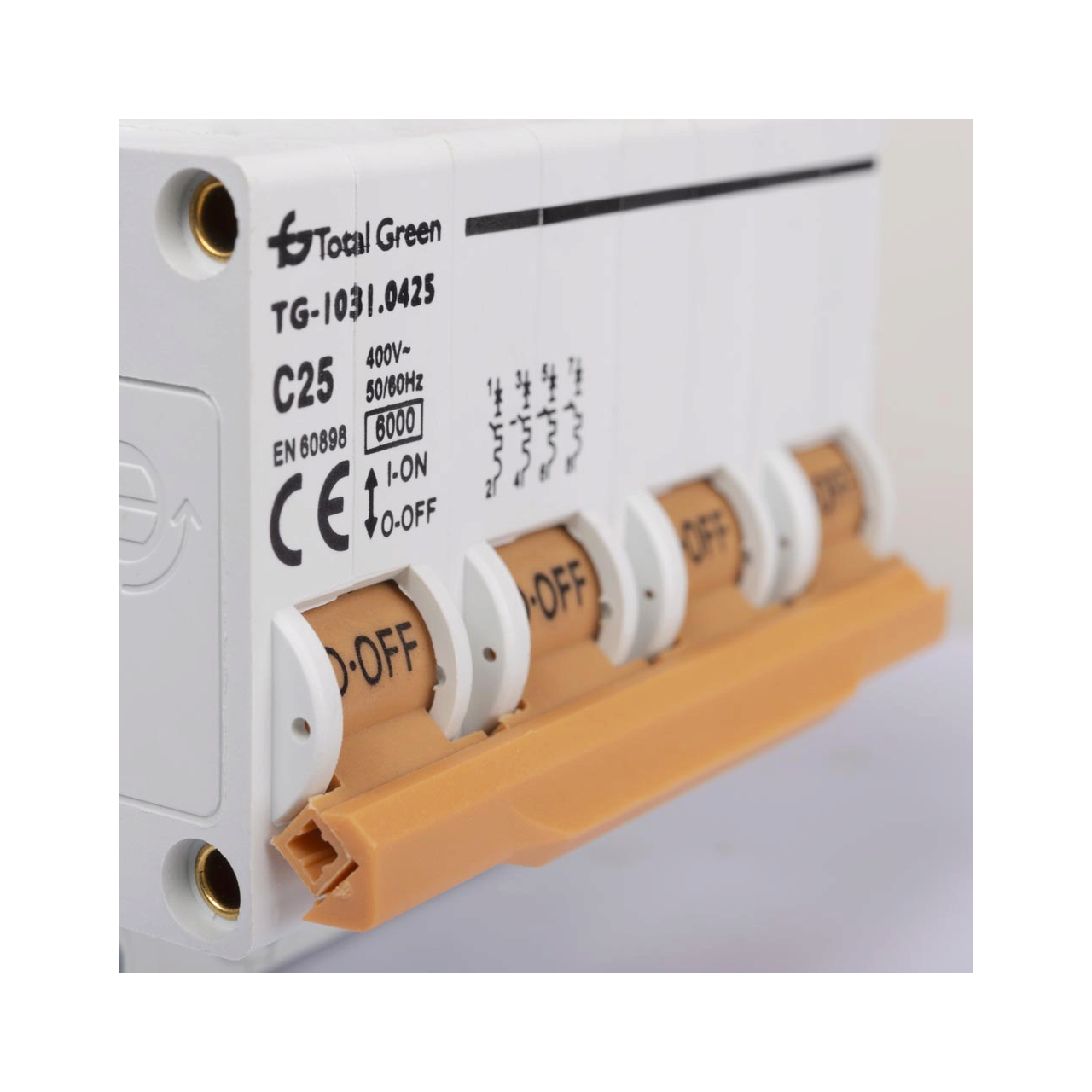 Gama de protectii marca Total Green este atent selectata si produsa pentru a oferi solutii inovative si fiabile pentru problemele dumneavoastra. Orice dificultate ati putea intalni, noi va stam la dispozitie cu produse variate si potrivite atat financiar, cat si calitativ. In acest sens, prezentam un model de intrerupator automat de tip 4P ce functioneaza cu un curent nominal de 25A, la o frecventa nominala de 50-60Hz. De asemenea, capacitatea de rupere nominala are valoarea de 6kA pentru o curba caracteristica de tip C.