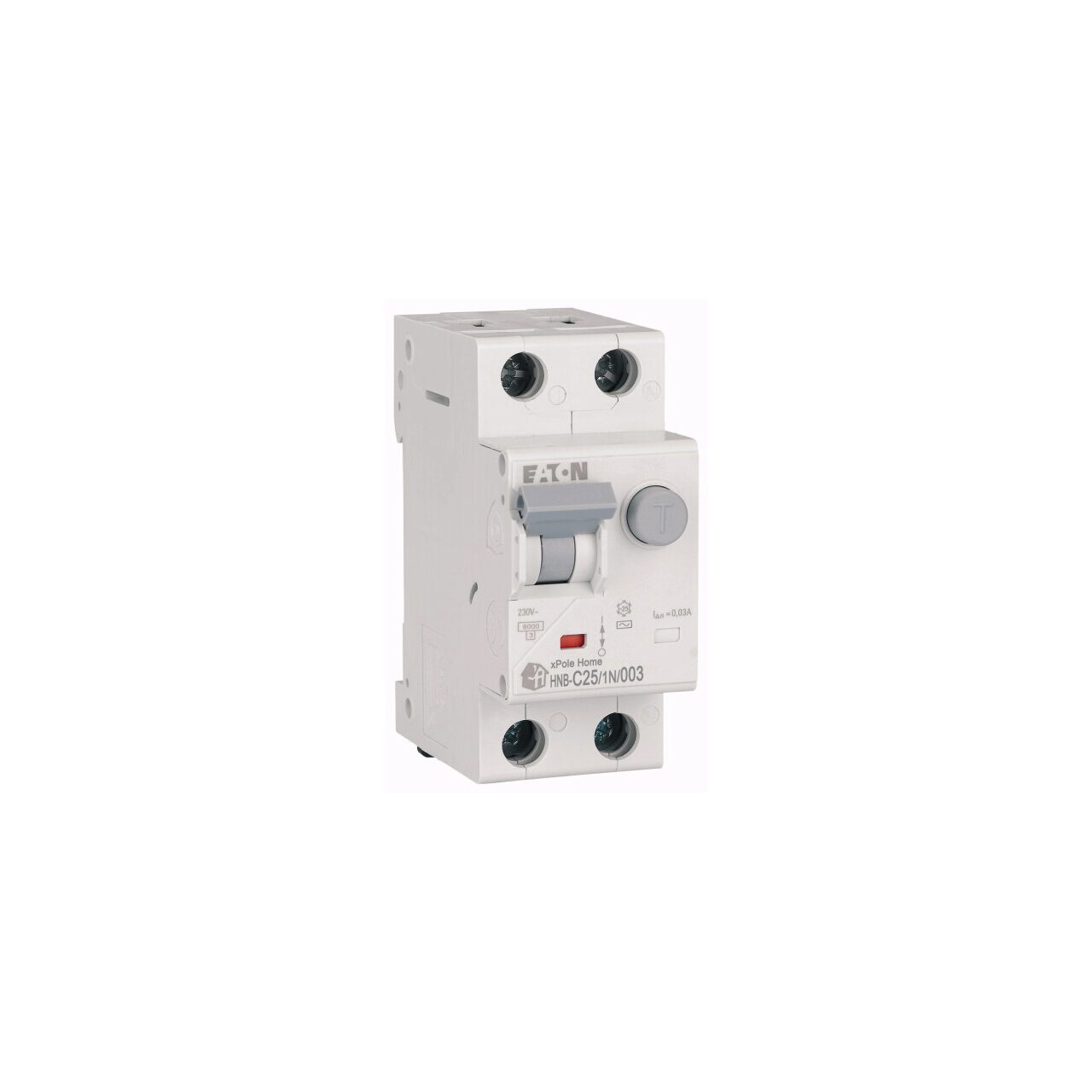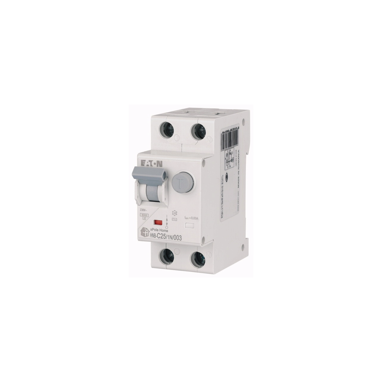 Gama de protectii marca Eaton este atent selectata si produsa pentru a oferi solutii inovative si fiabile pentru problemele dumneavoastra. Orice dificultate ati putea intalni, noi va stam la dispozitie cu produse variate si potrivite atat financiar, cat si calitativ. In acest sens, prezentam un model de intrerupator de tip HNB-C25/1N/003 cu 1P+N ce functioneaza cu un curent nominal de 25A, la o frecventa nominala de 50-60Hz si la o tensiune nominala de 230V. De asemenea, capacitatea de rupere nominala are valoarea de 6kA pentru o curba de declansare de tip C si un factor de protectie IP20.