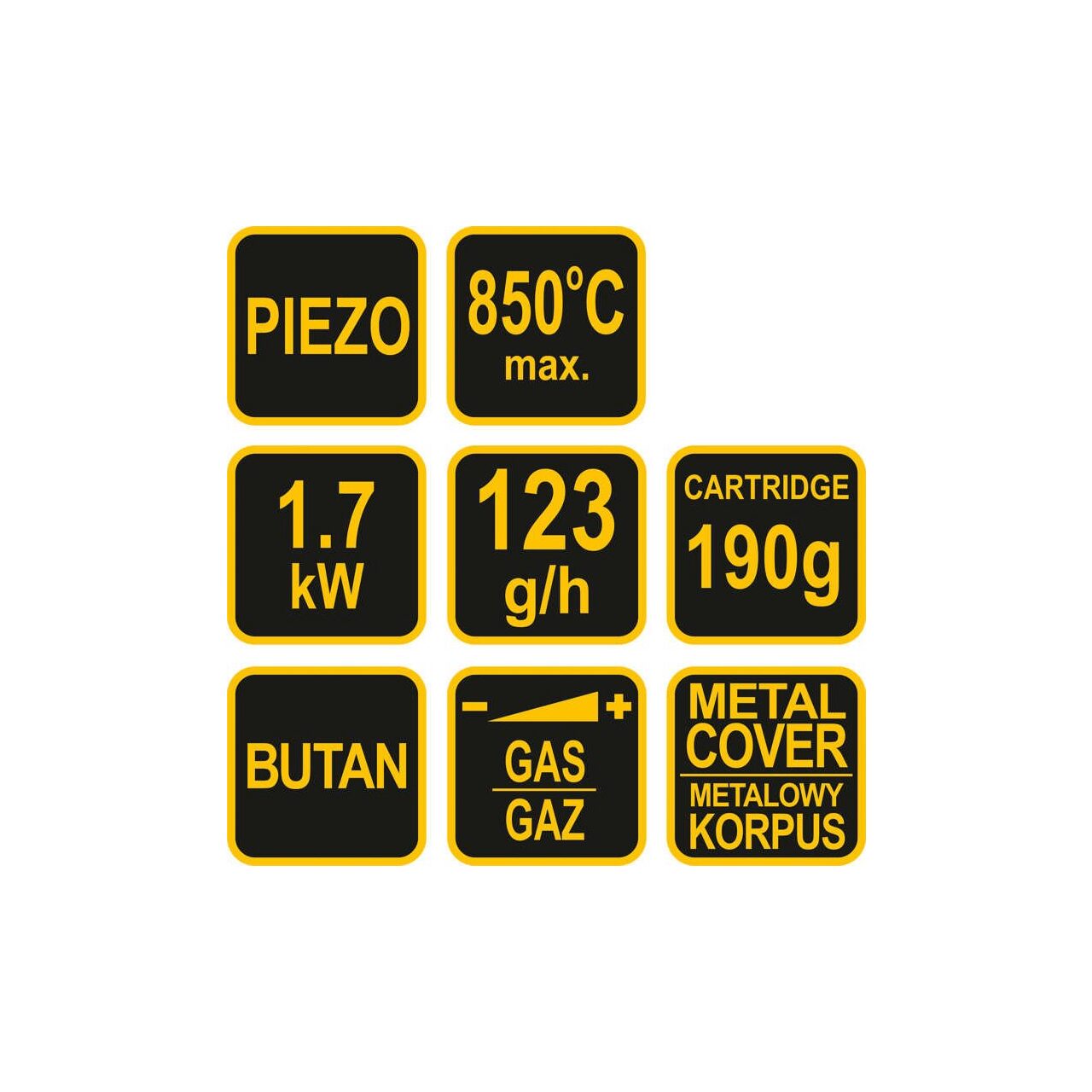 Este alimentat cu gaz propan-butan în cartușe de 190 g (tip EN417 200 - disponibil pe scară largă pe piață). Arzătorul are o putere de 1,7 kW și o temperatură de până la 850 ° C. Consumul mediu de gaz este de 123g / h . Puterea flăcării, pe de altă parte, poate fi reglată lin cu ajutorul butonului încorporat. Arzătorul are aprindere PIEZO , ceea ce face ca funcționarea sa să fie foarte convenabilă și simplă.