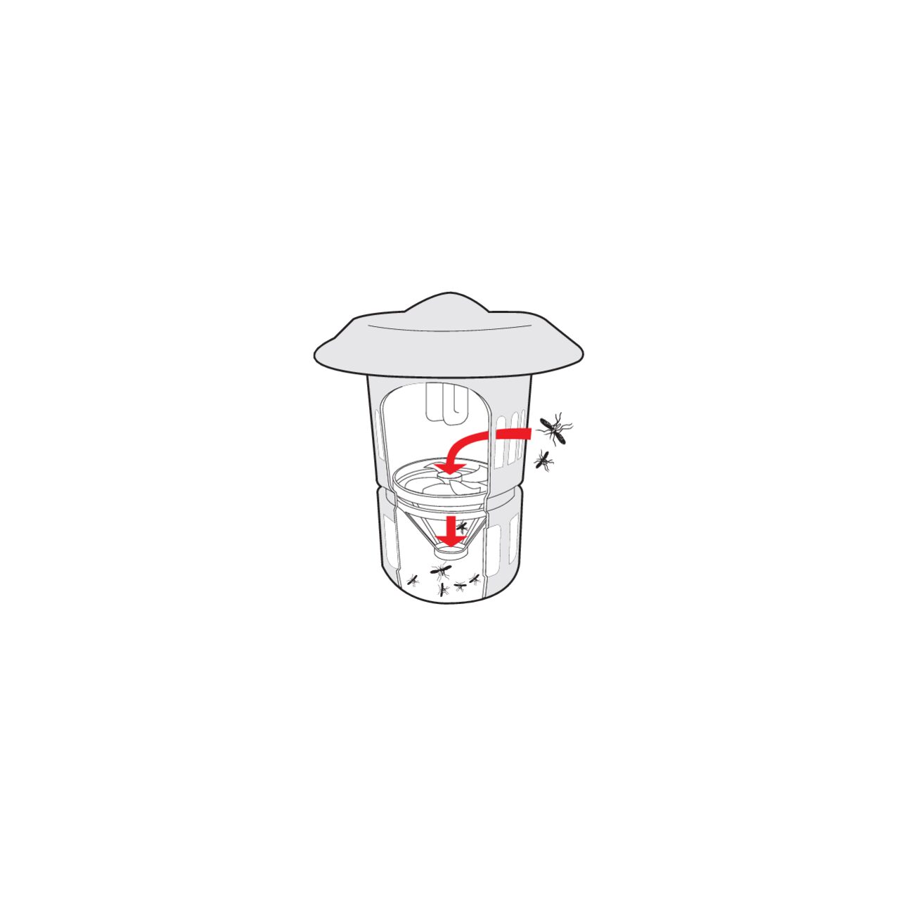 Tava de apă din jurul lămpii și scurgerea cu găuri în acoperiș colectează apa pentru a atrage și prinde larvele de țânțari chiar de la început. Clima umedă încurajează, de asemenea, țânțarii să intre, iar ventilatorul încorporat îi atrage înăuntru.