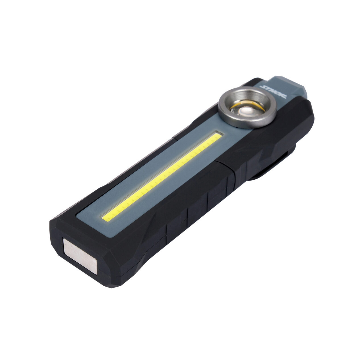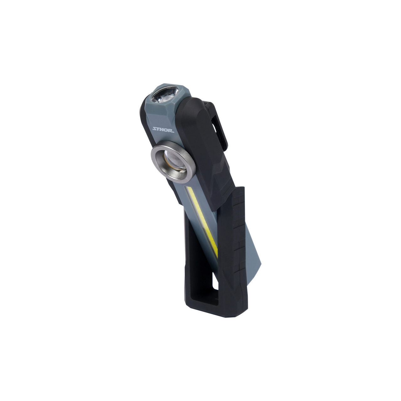 Lampă de atelier cu trei surse de lumină. Poate fi agățat de un cârlig sau clemă sau atașată de banc folosind magnetul din bază. Unghiul de iluminare poate fi reglat datorită carcasei rabatante. Tipuri de funcționare: lanternă LED de putere - diodă COB rotundă - diodă COB lungă.