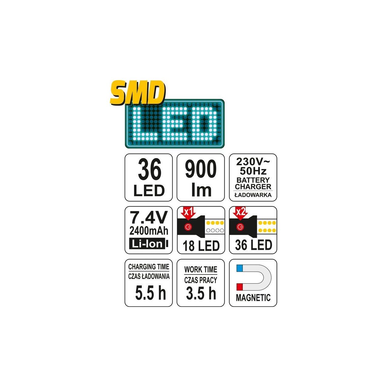 - 2 moduri de iluminare: 100% (36 SMD) și 50% (18 SMD)