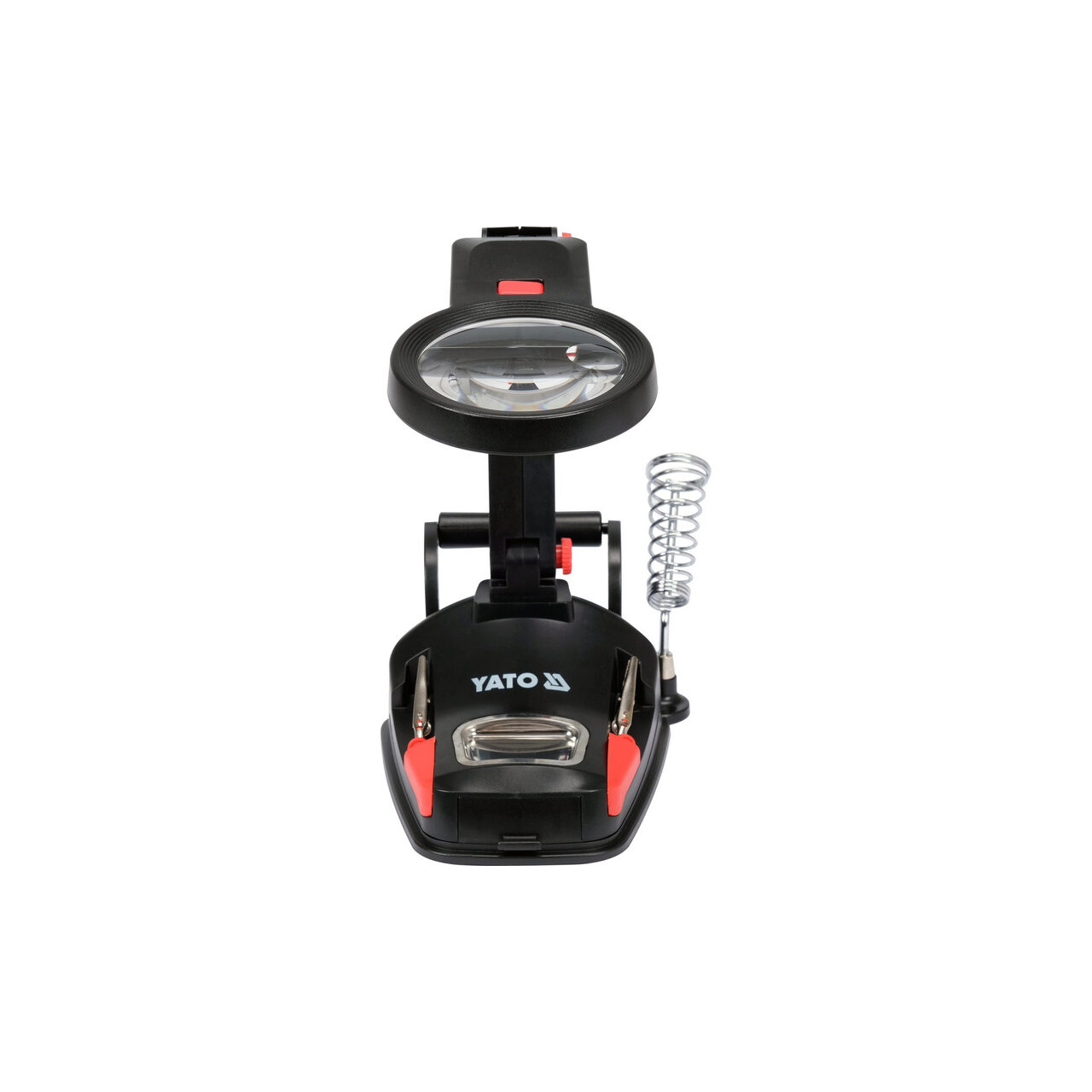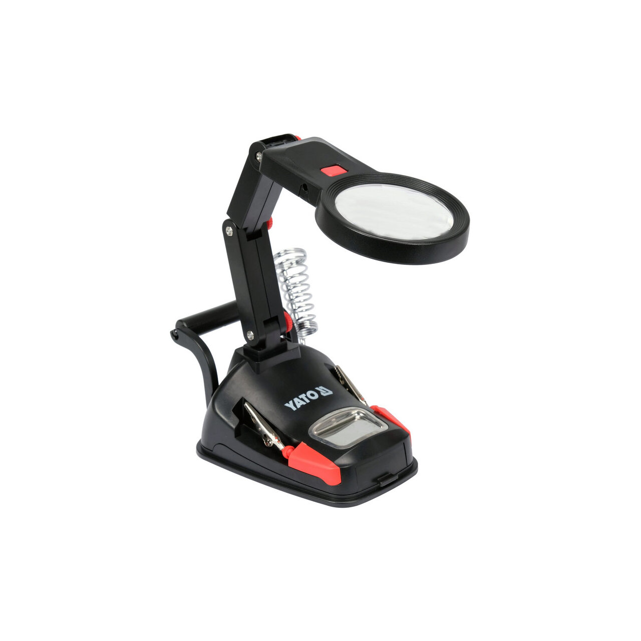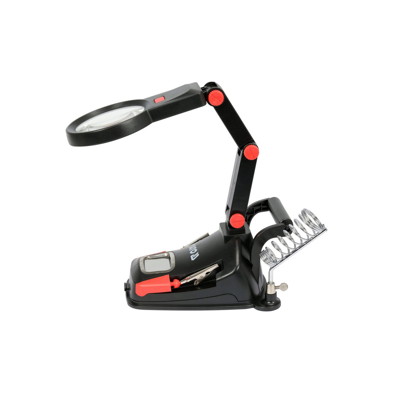 Mâner „de a treia mână” cu iluminare inelară cu 10 LED-uri. Lupă dublă - cea mai mare, cu diametrul de 75 mm, oferă o mărire de x 3. Lupa mai mică - încorporată, cu diametrul de 20 mm, mărește imaginea de x 4,5. Brațul rotativ la 360 de grade cu reglare a unghiului în trei puncte vă permite să lucrați liber atât în interiorul, cât și în afara zonei clemelor auxiliare. Două cleme crocodil montate pe brațe mobile și articulații sferice duble oferă o gamă largă de posibilități de adaptare a clemelor atât la bijuterii mici, cât și la PCB-uri mici. Un suport pentru un burete de lipit, un soclu pentru fier, o rolă pentru montarea metalului de adaos de lipit și un compartiment, de ex. pentru șuruburile de demontare, ajută la organizarea muncii.