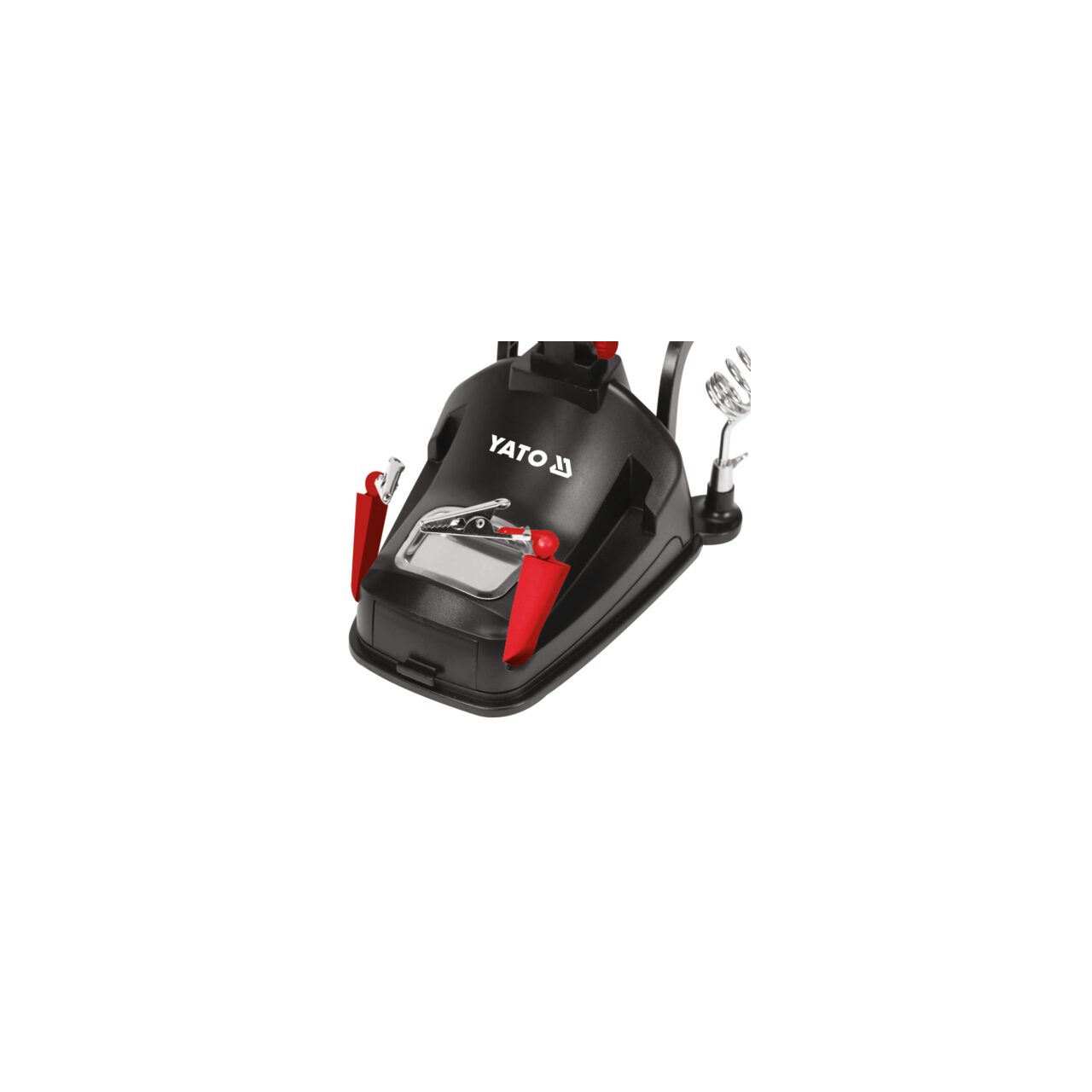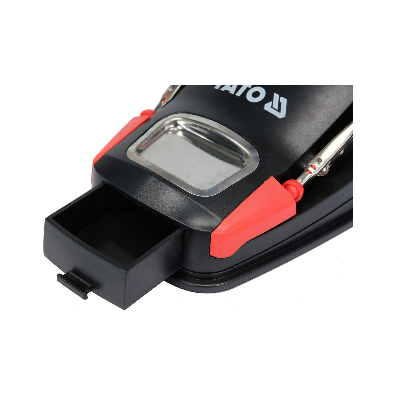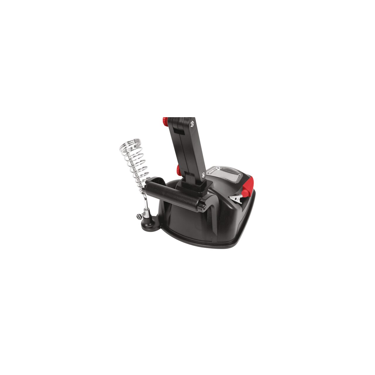 Mâner „de a treia mână” cu iluminare inelară cu 10 LED-uri. Lupă dublă - cea mai mare, cu diametrul de 75 mm, oferă o mărire de x 3. Lupa mai mică - încorporată, cu diametrul de 20 mm, mărește imaginea de x 4,5. Brațul rotativ la 360 de grade cu reglare a unghiului în trei puncte vă permite să lucrați liber atât în interiorul, cât și în afara zonei clemelor auxiliare. Două cleme crocodil montate pe brațe mobile și articulații sferice duble oferă o gamă largă de posibilități de adaptare a clemelor atât la bijuterii mici, cât și la PCB-uri mici. Un suport pentru un burete de lipit, un soclu pentru fier, o rolă pentru montarea metalului de adaos de lipit și un compartiment, de ex. pentru șuruburile de demontare, ajută la organizarea muncii.