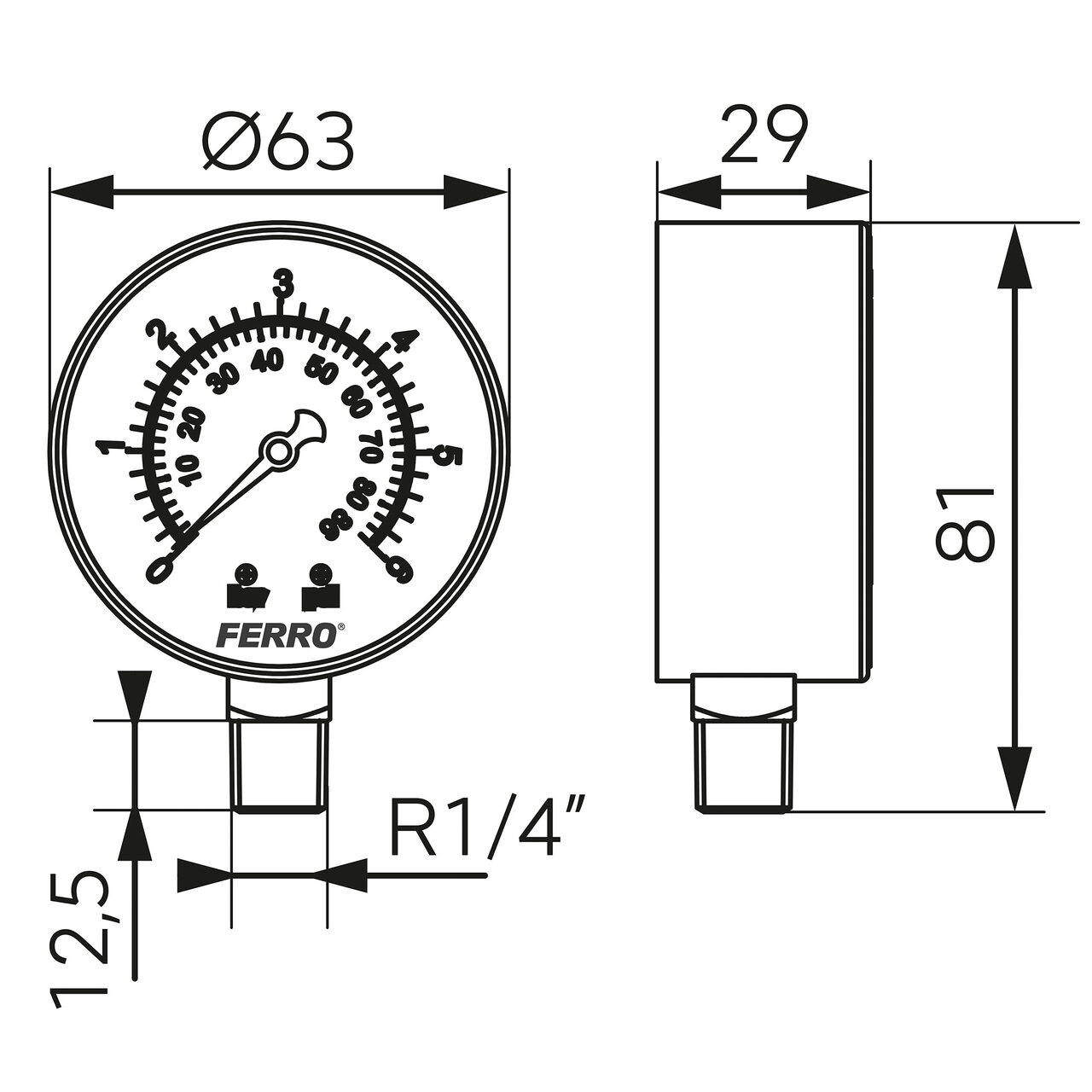 Manometru 63 mm 1/4" radial, 0-6 bari, Ferro M6306R