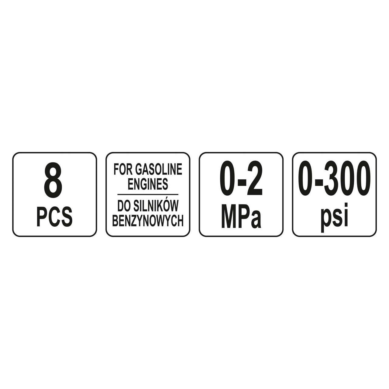 Caracteristici produsSet de 8 piese pentru măsurarea presiunii de compresie la motoarele pe benzină.