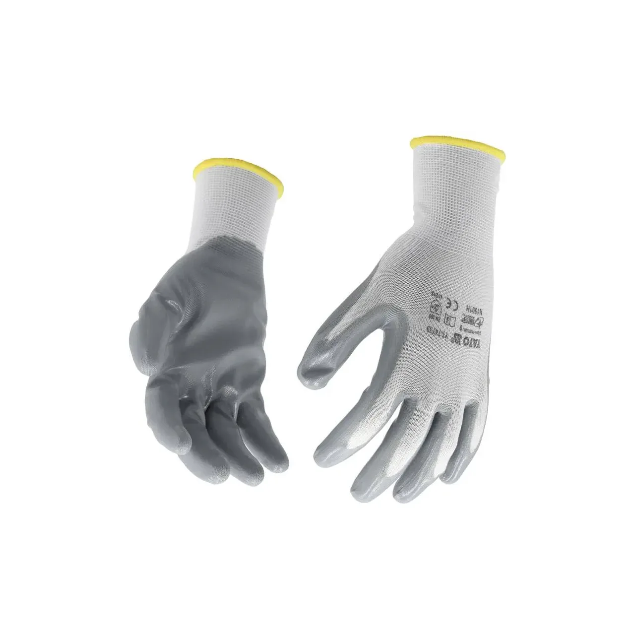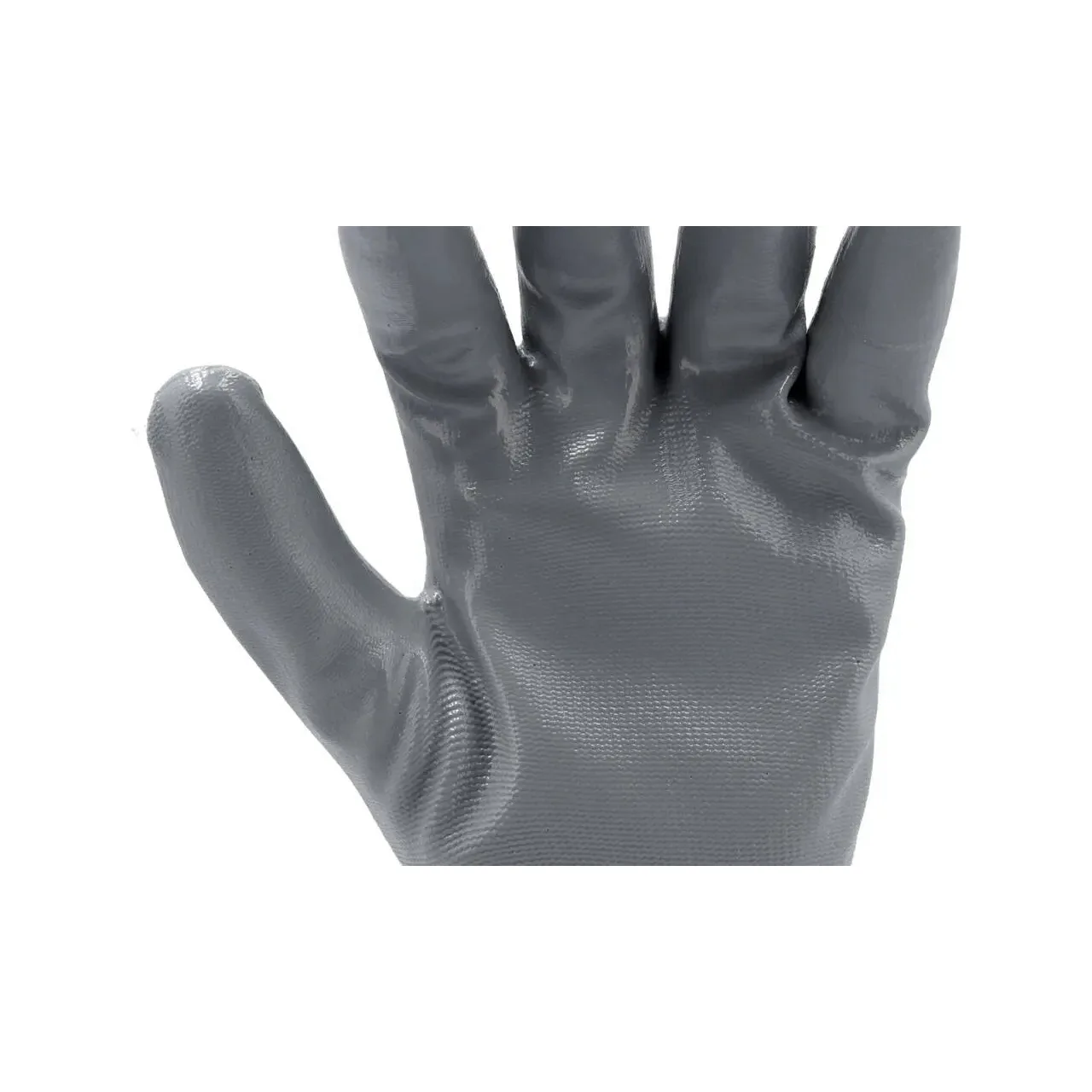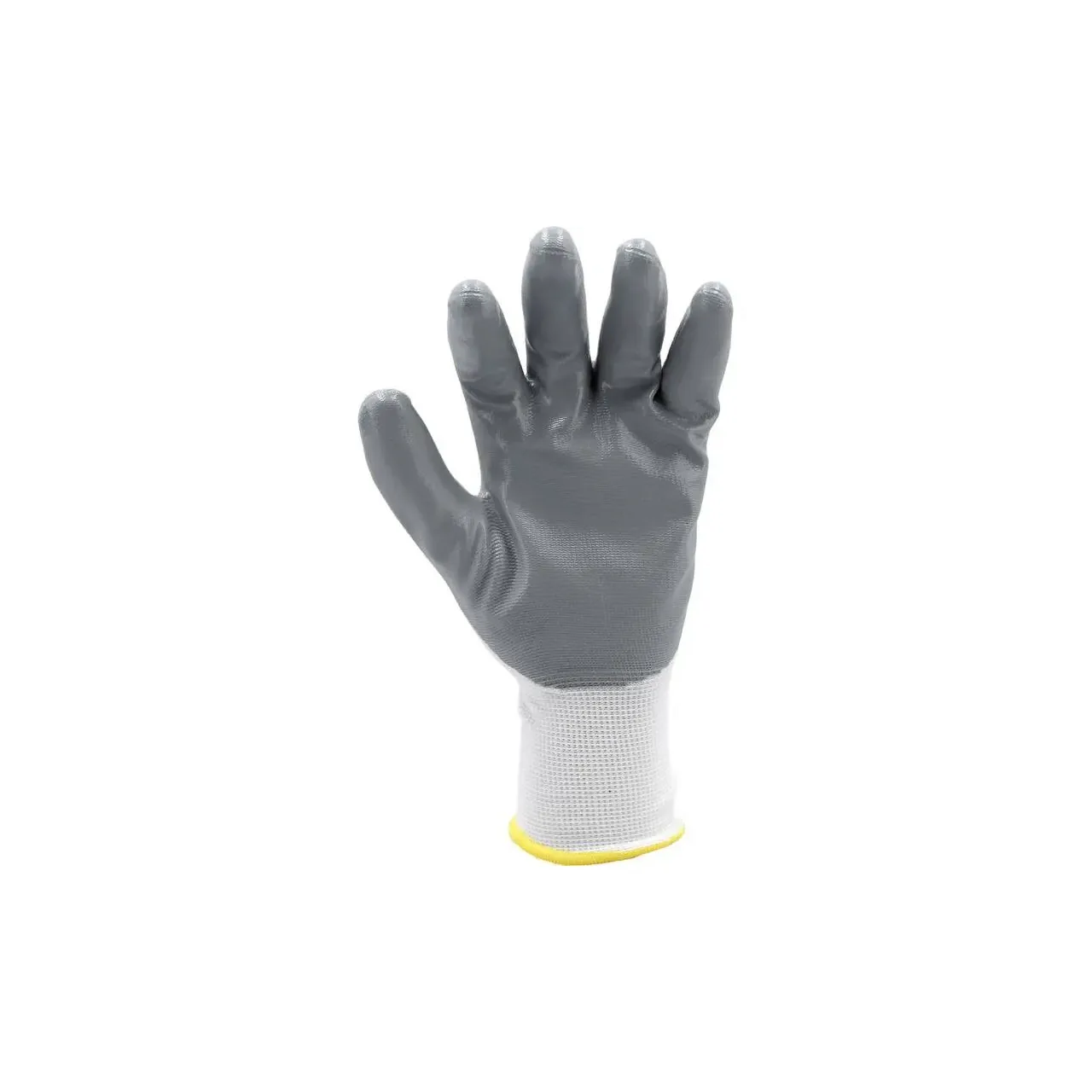 YT-74739 mănuși de lucru de protecție din nylon alb, acoperite în palmă cu nitril gri.