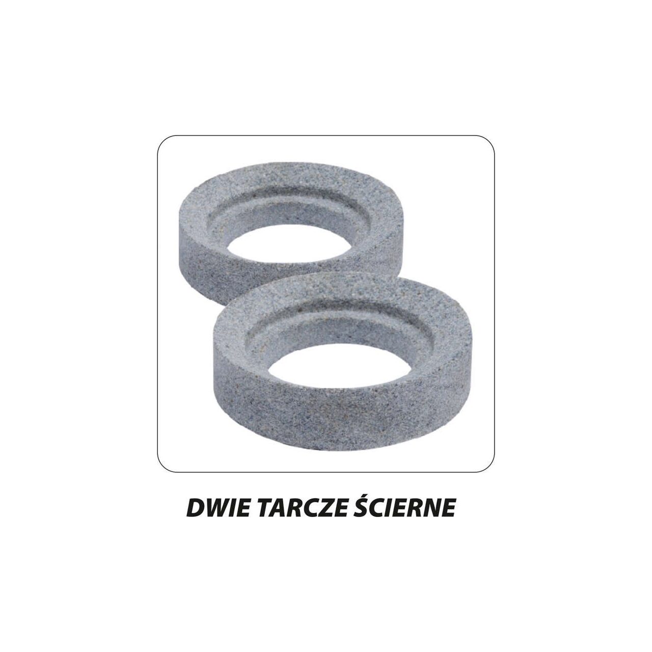 Caracteristici produsUn ascuțitor pentru ascuțirea unei lame de burghiu din oțel. Ascuțitorul este echipat cu două capete de lucru care permit ascuțirea unei game largi de diametre de găurire. Dispozitivul este proiectat pentru funcționare intermitentă. Diametrul plăcii de șlefuit: 58 mm; 70 mm Diametrul burghiului: - 3 mm - 10 mm (placa 58 mm) - 8 mm - 16 mm (placa 70 mm) Unghiul punctului burghiului: 118 gradeDomenii utilizareAscuțitorul este folosit pentru a ascuți burghiele plictisitoare. Este posibil să ascuți burghiele destinate găuririi în burghie metalice sau universale. Ascuțitorul nu este destinat ascuțirii burghiilor cu o lamă din materiale ceramice, burghie pentru lemn, burghie cu pene, burghie, burghie și burghie cu o formă de lamă, alta decât burghiele din oțel și burghiele universale.Metoda de utilizareAscuțirea burghiului: selectați orificiul din cap cu același diametru ca burghiul de ascuțit. Porniți dispozitivul de ascuțit cu comutatorul și așteptați până când placa de măcinare atinge viteza nominală. Introduceți burghiul în gaura din cap și, când auziți sunetul de măcinare, mișcați-l înainte și înapoi timp de 5-10 secunde, în timp ce apăsați burghiul cu o ușoară forță pe placa de măcinare. Scoateți burghiul din cap și apoi repetați operația pentru cealaltă margine a lamei burghiului. Marginea cea mai apropiată de marginea exterioară a capului este întotdeauna ascuțită. Găurile de cap au proiecții care limitează rotația burghiului în gaură. Acest lucru ușurează procesul de ascuțire.Atenţie! Fiecare suprafață trebuie ascuțită cu aceeași cantitate de timp și presată cu aceeași forță. Acest lucru va preveni ascuțirea neuniformă a burghiului. După ascuțirea burghiului, evaluați rezultatele muncii. Dacă vârful burghiului, după ascuțire, devine albastru sau diferit de culoarea naturală a oțelului, înseamnă supraîncălzirea suprafeței și presiunea burghiului ar trebui să fie redusă față de placa de măcinare în timpul ascuțirii. Dacă marginile burghiului nu au o lungime egală după ascuțire, reglați timpul și presiunea de ascuțire pe fiecare parte a burghiului. Conținutul pachetului- ascutitor - 2 atașamente - 2 discuriParametrii- Putere [W]: 70