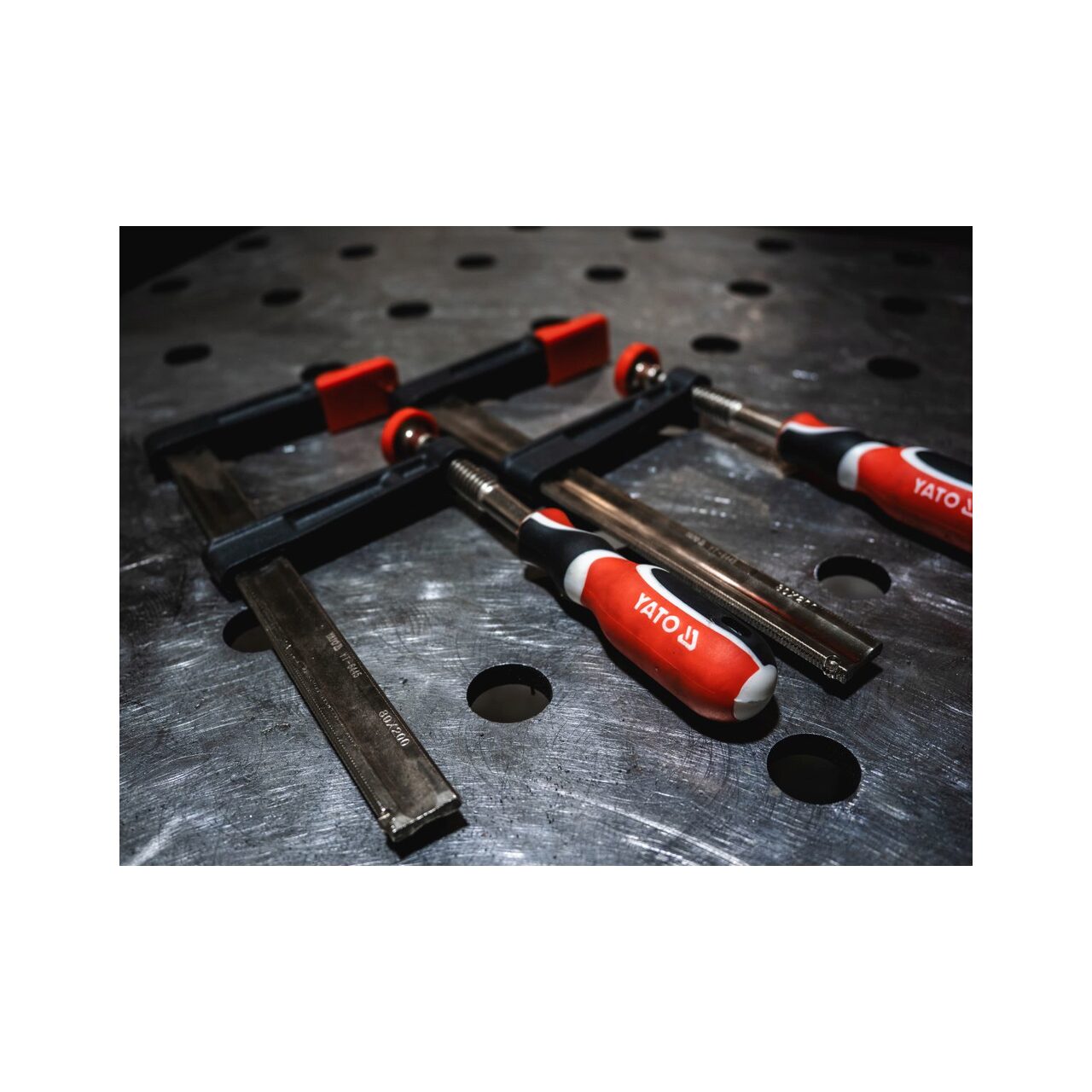 Clemă de tâmplar tip F. Șină groasă și stabilă, rigidizată cu embosare suplimentară. Brațe cu profil ranforsat, șurub cu filet special. Placa de presiune montată pe o articulație sferică se adaptează ușor la suprafață, iar capacele moi din plastic protejează materialul presat. Mânerul este acoperit cu material tehnic moale, care permite o prindere puternică a materialului. Clemă stabilă și puternică pentru lucrări de tâmplărie și asamblare.