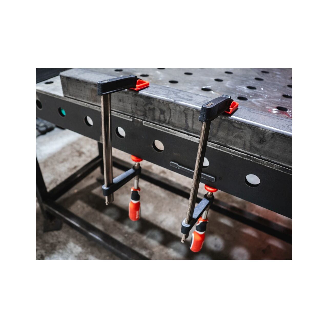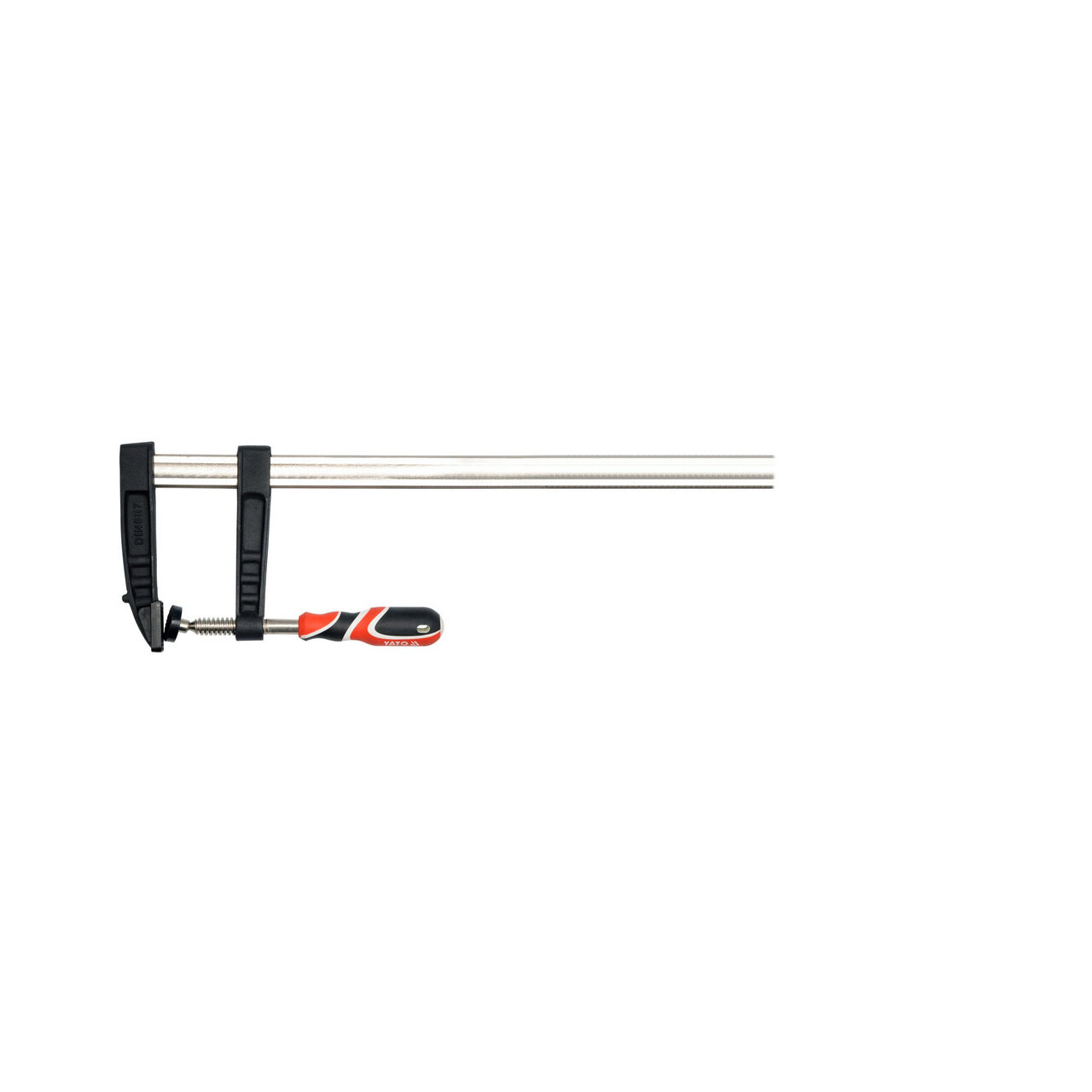 Clemă de tâmplar tip F. Șină groasă și stabilă, rigidizată cu embosare suplimentară. Brațe cu profil ranforsat, șurub cu filet special. Placa de presiune montată pe o articulație sferică se adaptează ușor la suprafață, iar capacele moi din plastic protejează materialul presat. Mânerul este acoperit cu material tehnic moale, care permite o prindere puternică a materialului. Clemă stabilă și puternică pentru lucrări de tâmplărie și asamblare.