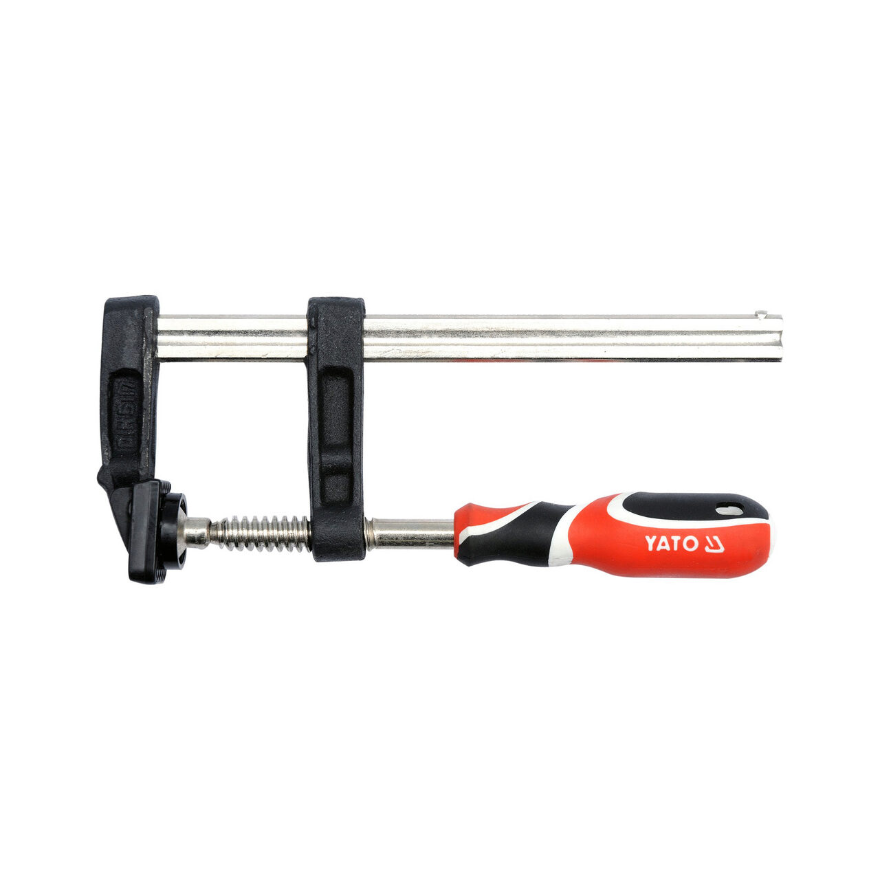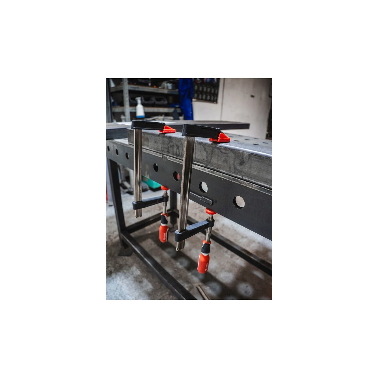 Clemă de tâmplar tip F. Șină groasă și stabilă, rigidizată cu embosare suplimentară. Brațe cu profil ranforsat, șurub cu filet special. Placa de presiune montată pe o articulație sferică se adaptează ușor la suprafață, iar capacele moi din plastic protejează materialul presat. Mânerul este acoperit cu material tehnic moale, care permite o prindere puternică a materialului. Clemă stabilă și puternică pentru lucrări de tâmplărie și asamblare.