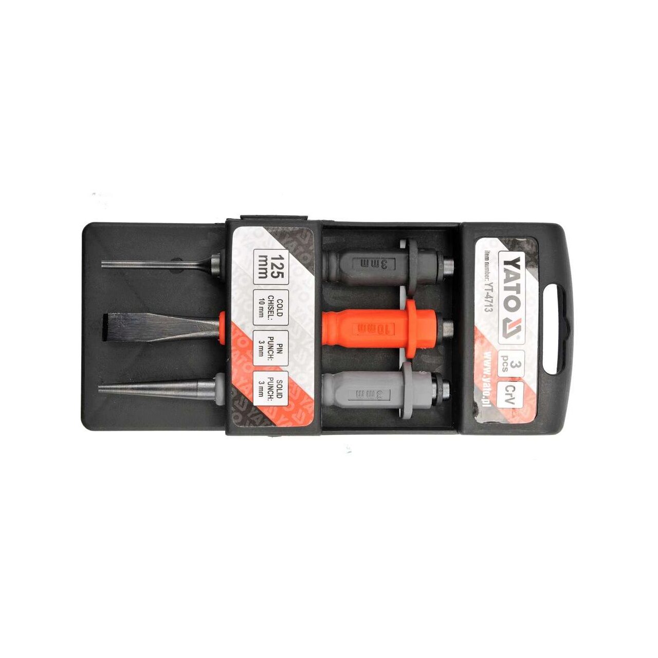 Setul include trei instrumente de bază - o dalta de lăcătuș de 10x125mm, un pumn cilindric de 3x125mm și un pumn conic de 3x125mm.