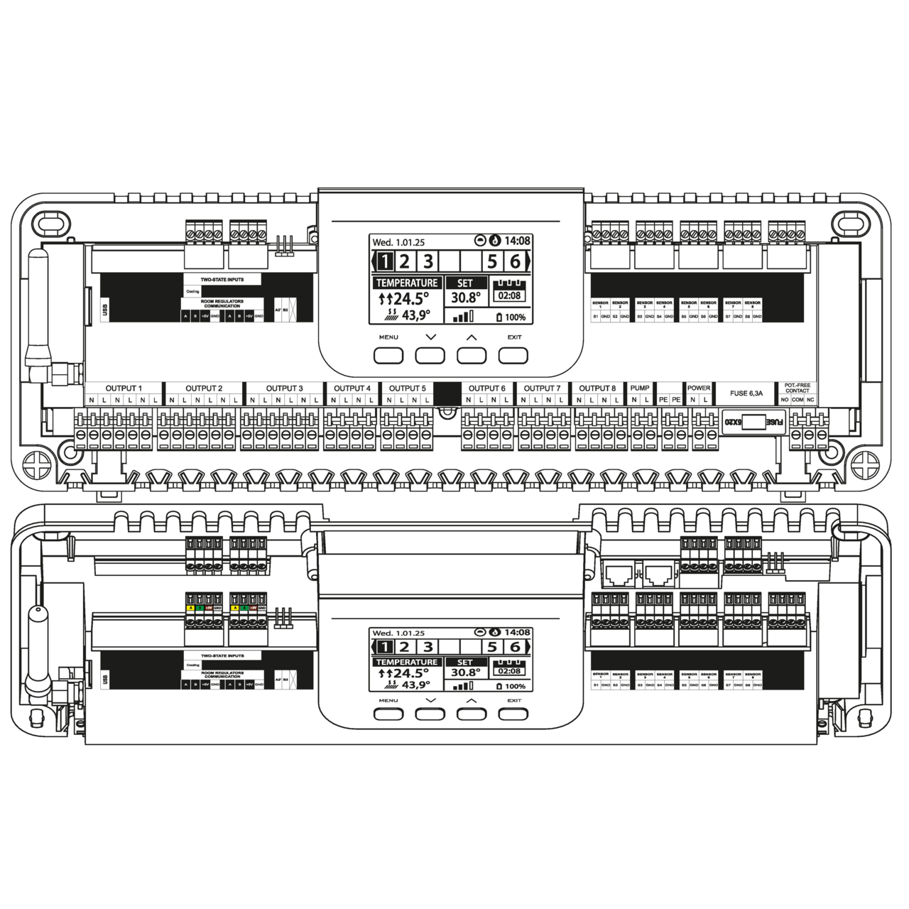 Pot fi controlate până la 8 circuite de încălzire, permițând gestionarea mai multor zone distincte dintr-o locuință sau spațiu comercial.