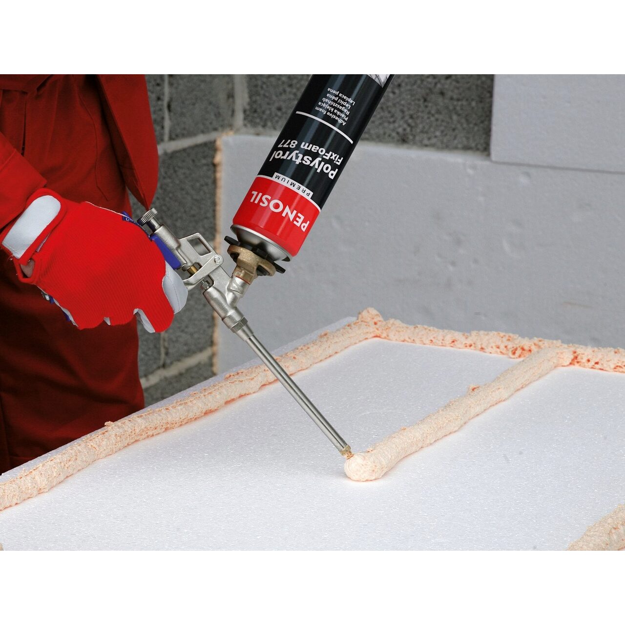 Tineți tubul de spumă în poziție verticală, fixați pistolul pe valva tubului de spumă, cu o mână țineți pistolul și cu cealaltă mână înșurubați tubul de spumă. Asiguraţi-vă că pistolul nu este îndreptat spre alte persoane atunci când este manipulat. Se agită bine produsul înainte de utilizare de minim 20 de ori. Debitul spumei se poate ajusta cu ajutorul trăgaciului pistolului. În caz de umiditate scăzută (sub 50% RH), suprafața trebuie umezită pentru că spuma expandează la umiditate. O suprafață umezită asigură o uscare mai rapidă și rezultate mai bune. La temperaturi scăzute, spuma trebuie încălzită la lucrul în încăperi calde sau sub apă. Temperatura camerei sau a apei nu trebuie să depășească +30°C. Aplicaţi spuma adezivă pe panoul de izolaţie în cantitate egală pe suprafaţă, (3-4 cm de la margine). Se aplică o bandă pe centrul panoului, paralel cu latura cea mai lungă a acestuia (distanţa dintre benzi aproximativ 25cm). Aşteptaţi aproximativ 2 minute după aplicarea spumei, apoi apăsaţi pe panoul de perete. Poziţia panourilor lipite cu spumă de polistiren poate fi ajustată în termen de până la 5 minute după ce au fost fixate de perete. În cazul în care spuma este aplicată pe plafoane de balcoane sau pe suprafeţe mari, trebuie utilizate sisteme de fixare.