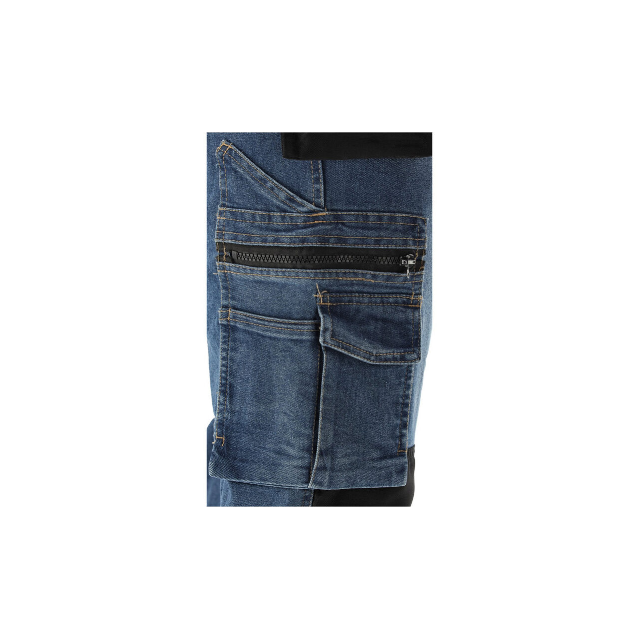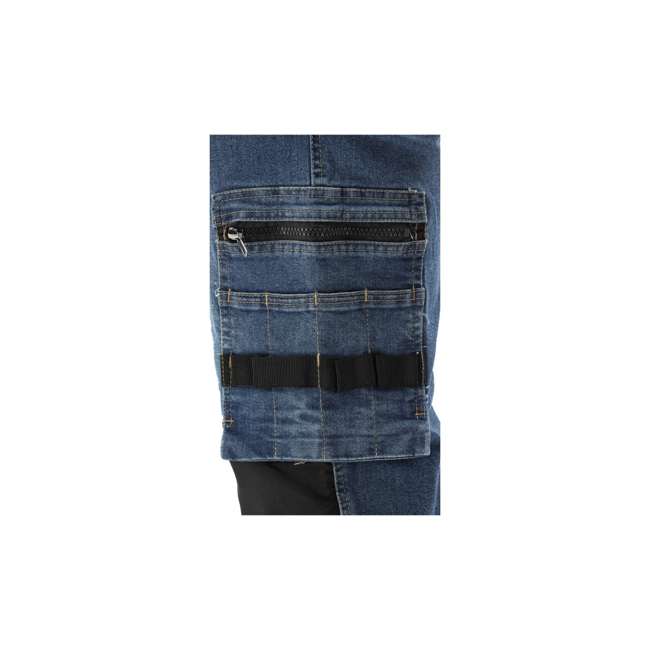 Pantaloni de lucru de montator cu elastan, confecționați din denim elastic și uzat. Până la șaptesprezece buzunare, inclusiv unul cu închidere cu velcro, două cu fermoar și două buzunare detașabile pentru unelte. Un număr mare de buzunare de bază și buzunare de asamblare fabricate din material durabil vor ajuta la organizarea muncii unui tâmplar, montator de acoperișuri sau instalator.