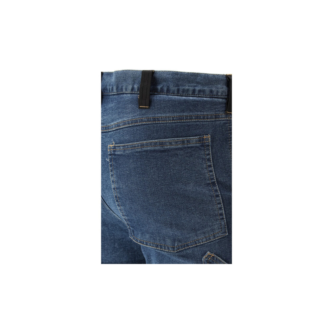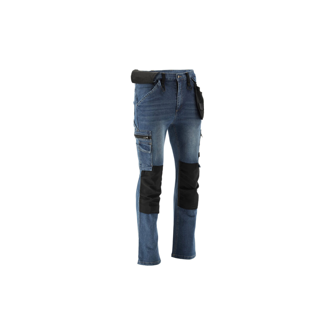 Pantaloni de lucru de montator cu elastan, confecționați din denim elastic și uzat. Până la șaptesprezece buzunare, inclusiv unul cu închidere cu velcro, două cu fermoar și două buzunare detașabile pentru unelte. Un număr mare de buzunare de bază și buzunare de asamblare fabricate din material durabil vor ajuta la organizarea muncii unui tâmplar, montator de acoperișuri sau instalator.