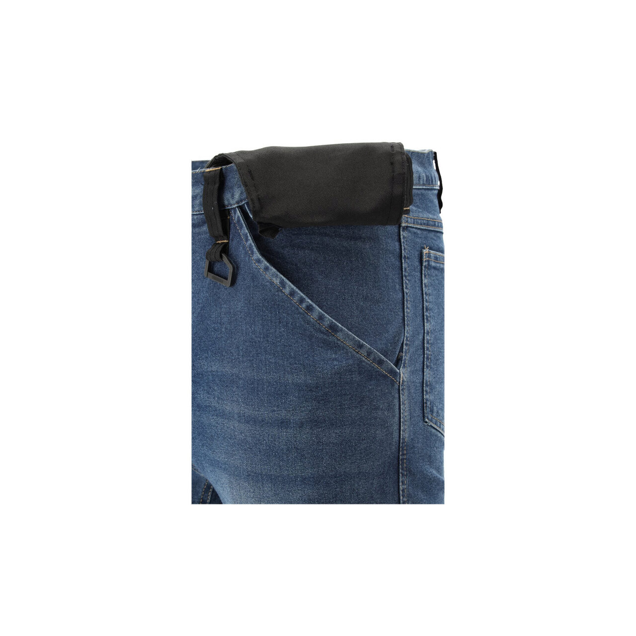 Pantaloni de lucru de montator cu elastan, confecționați din denim elastic și uzat. Până la șaptesprezece buzunare, inclusiv unul cu închidere cu velcro, două cu fermoar și două buzunare detașabile pentru unelte. Un număr mare de buzunare de bază și buzunare de asamblare fabricate din material durabil vor ajuta la organizarea muncii unui tâmplar, montator de acoperișuri sau instalator.