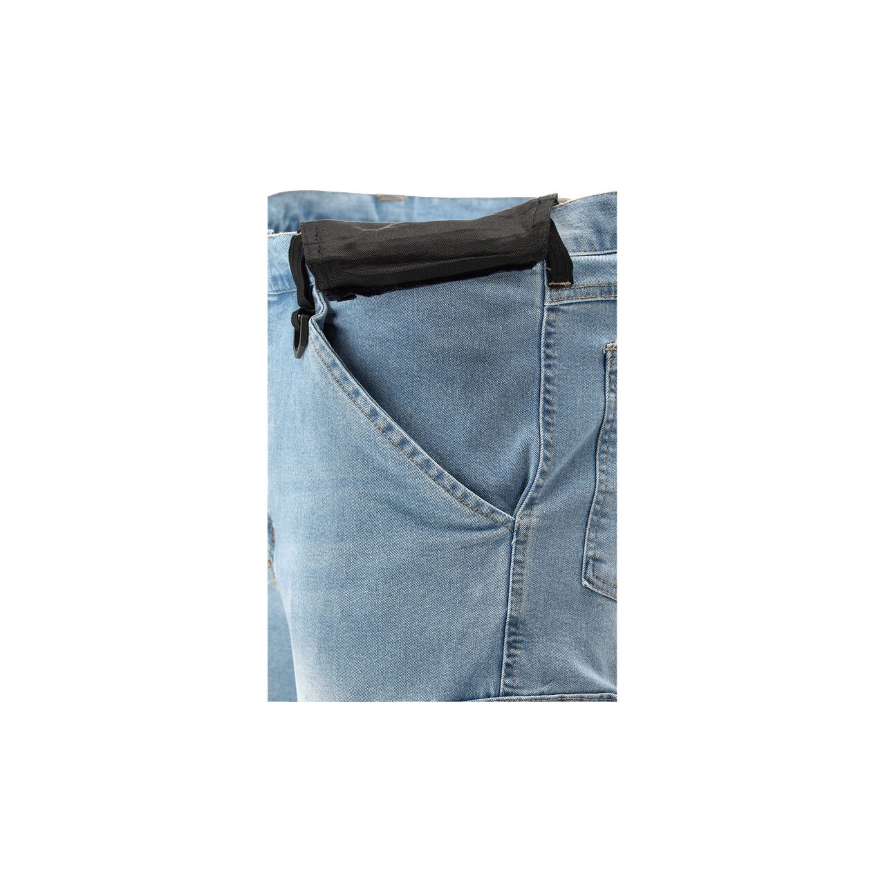 Pantaloni de lucru de montator cu elastan, confecționați din denim elastic și uzat. Până la șaptesprezece buzunare, inclusiv unul cu închidere cu velcro, două cu fermoar și două buzunare detașabile pentru unelte. Un număr mare de buzunare de bază și buzunare de asamblare fabricate din material durabil vor ajuta la organizarea muncii unui tâmplar, montator de acoperișuri sau instalator.