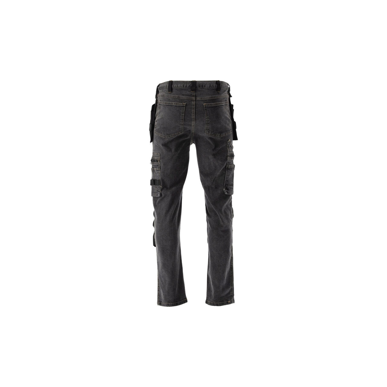 Pantaloni de lucru de montator cu elastan, confecționați din denim elastic și uzat. Până la șaptesprezece buzunare, inclusiv unul cu închidere cu velcro, două cu fermoar și două buzunare detașabile pentru unelte. Un număr mare de buzunare de bază și buzunare de asamblare fabricate din material durabil vor ajuta la organizarea muncii unui tâmplar, montator de acoperișuri sau instalator.