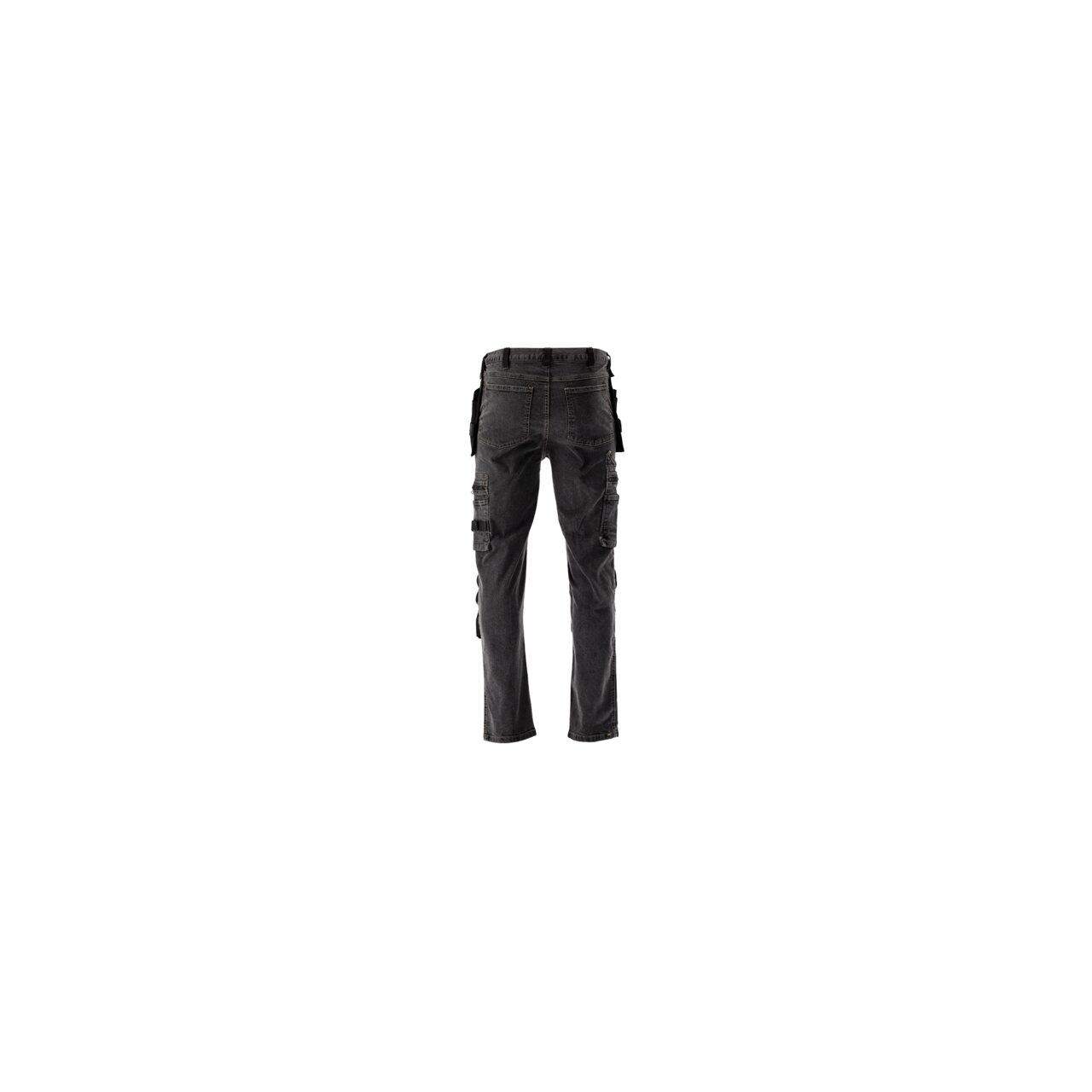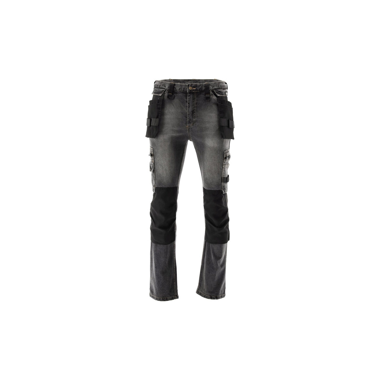 Pantaloni de lucru de montator cu elastan, confecționați din denim elastic și uzat. Până la șaptesprezece buzunare, inclusiv unul cu închidere cu velcro, două cu fermoar și două buzunare detașabile pentru unelte. Un număr mare de buzunare de bază și buzunare de asamblare fabricate din material durabil vor ajuta la organizarea muncii unui tâmplar, montator de acoperișuri sau instalator.