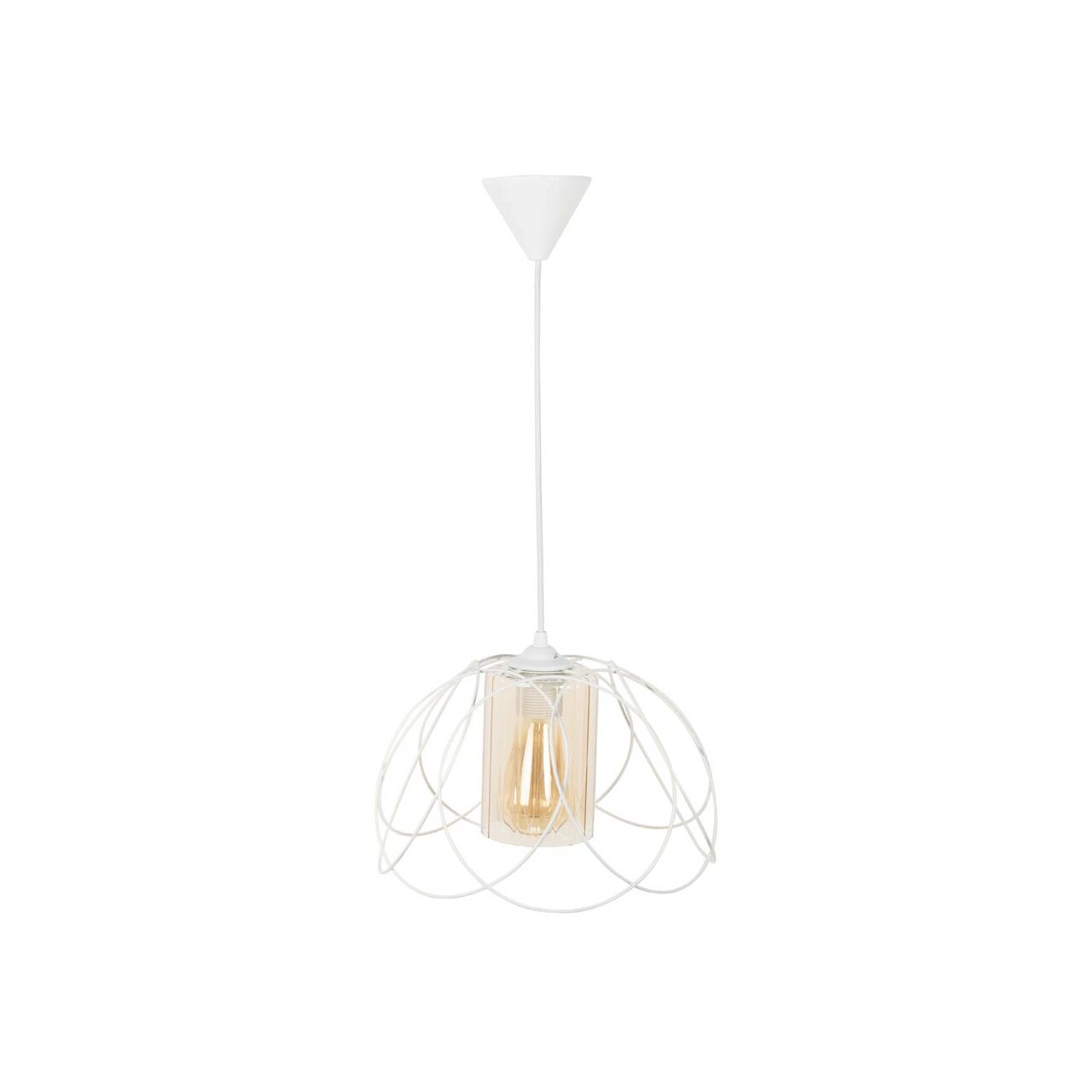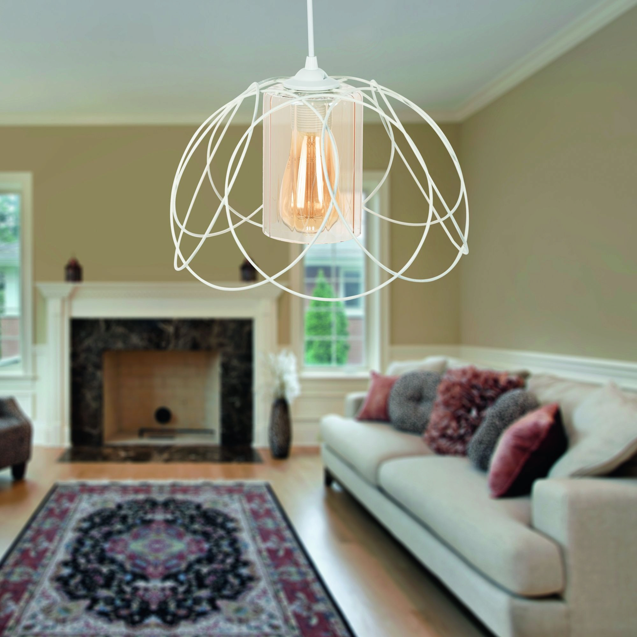 Pendulul din imagine poate fi utilizat cu usurinta in camera de zi, avand un design placut unde culoarea sa alba se imbina perfect cu nuanta aplicatiilor sale. Acesta functioneaza cu o singura sursa luminoasa de tip E27, fapt ce face ca lumina emisa de acesta sa fie o alegere ideala atat pe timp de zi, cat si pe timp de noapte. Valoarea puterii nominale de 60W, tipica acestor surse, confera suficienta intensitate luminii si fac din acest corp decorativ cea mai buna alegere in orice situatie.