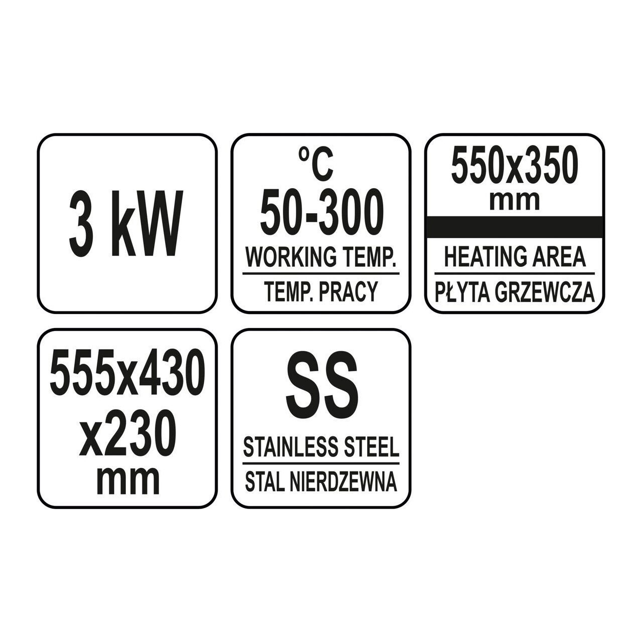 Încălzitorul de 3.0kW are control prin intermediul unui potențiometru cu temperatură reglabil în intervalul 50 ~ 300ºC , situat pe panoul frontal. Pe partea din spate a dispozitivului există un comutator rezistent la stropi care vă permite să opriți grillul fără a deconecta cablul de alimentare de la rețea. Dispozitivul este alimentat de 230V ~ 50Hz. Siguranța încorporată împiedică supraîncălzirea grătarului.