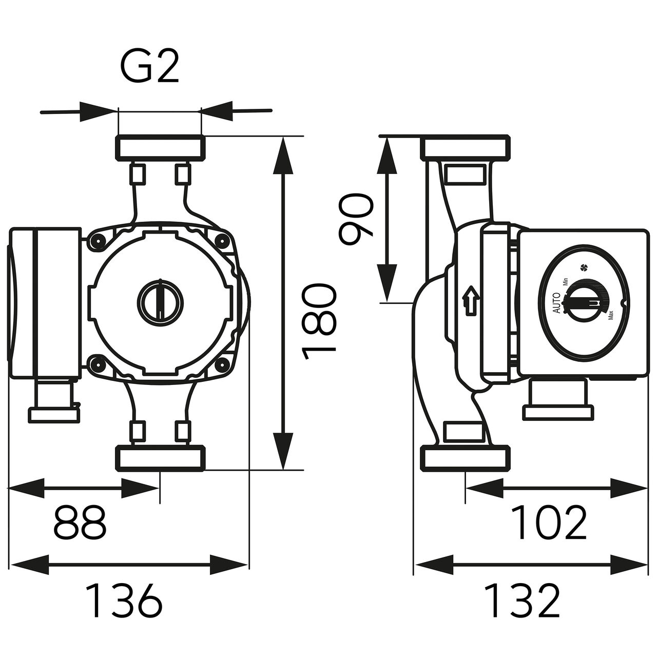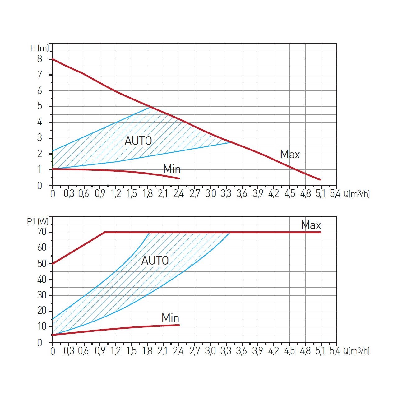 Proiectată pentru gestionarea debitului în instalații de încălzire și circulația agentului termic, pompa asigură parametri constanți într-o plajă amplă de lucru. Intervalul de temperatură al lichidului de +2 - +110 °C și presiunea maximă de lucru de 10 bar susțin utilizarea în circuite variate, iar înălțimea de ridicare de 8 m acoperă majoritatea traseelor rezidențiale. Racordul G2 și distanța între racorduri de 180 mm simplifică integrarea în instalațiile existente. Debit maxim 5,0 m³/h pentru o distribuție eficientă a căldurii. Instalarea se face cu axul central în poziție orizontală, cu presetupa îndreptată în jos sau lateral, pentru lubrifiere și etanșare corecte pe termen lung. Concepută pentru eficiență, pompa funcționează cu mod AUTO MIN-MAX reglabil continuu, adaptând automat performanța la cerințele circuitului. Consumul de 5 – 70 W și indicele de eficiență energetică IEE ≤0,23 reduc necesarul de energie în exploatare. Alimentarea este ~230 V (-6% – +10%), 50/60 Hz, iar clasa de izolație H și clasa de siguranță IP 42 susțin utilizarea în spații tehnice protejate. Suportă mediu cu 30% glicol apă și temperatură ambiantă 0 - +40 °C (RH <95%). Presiunea minimă de intrare variază cu temperatura lichidului: 0,05 bar până la 85 °C; 0,28 bar până la 90 °C; 1,00 bar până la 110 °C, pentru funcționare stabilă fără cavitație.