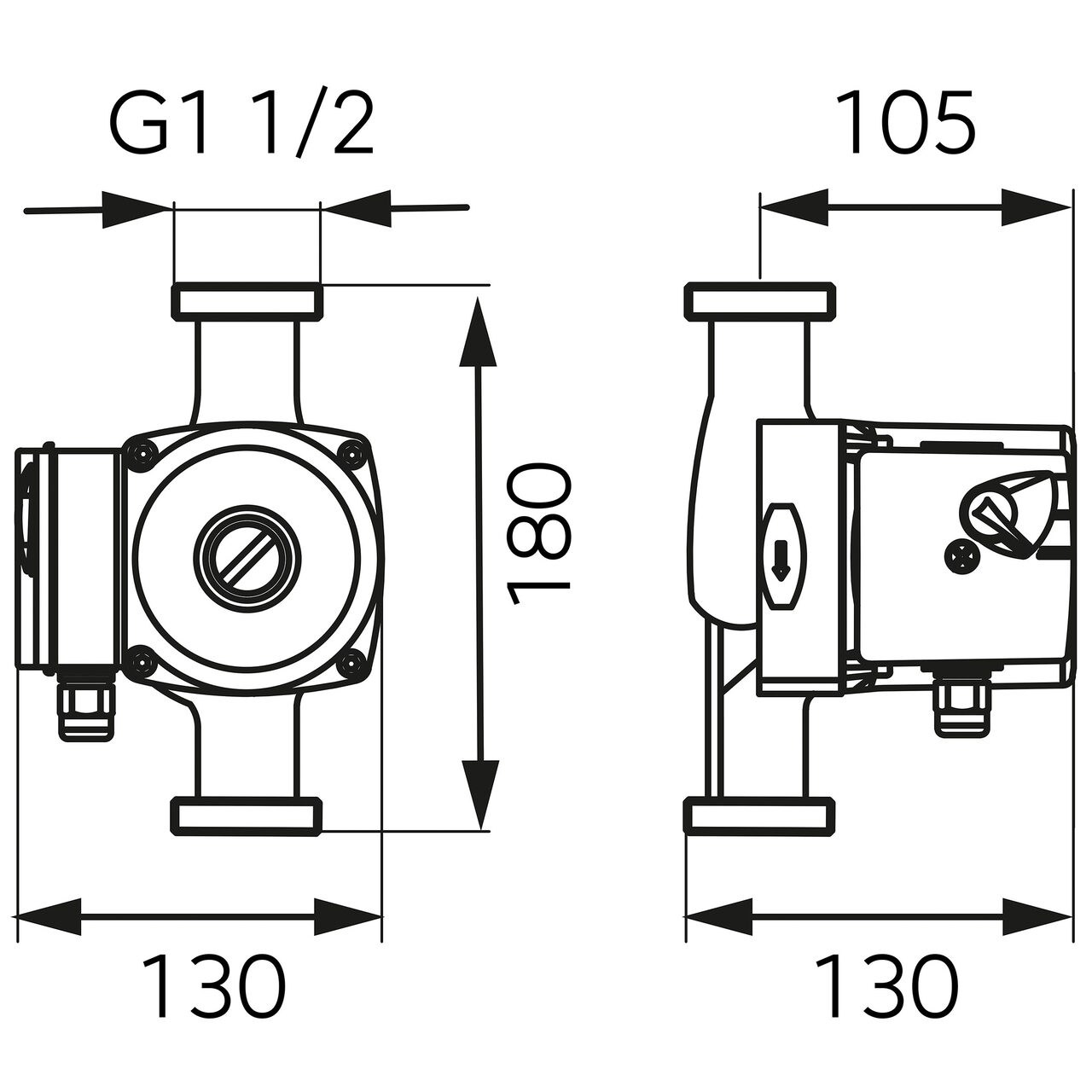 Pompa are racord G1 1/2 (tip 6/4") și distanță între racorduri de 180 mm. Funcționează la ~230V, 50-60 Hz. Verificați ca instalația să respecte aceste dimensiuni și alimentarea.