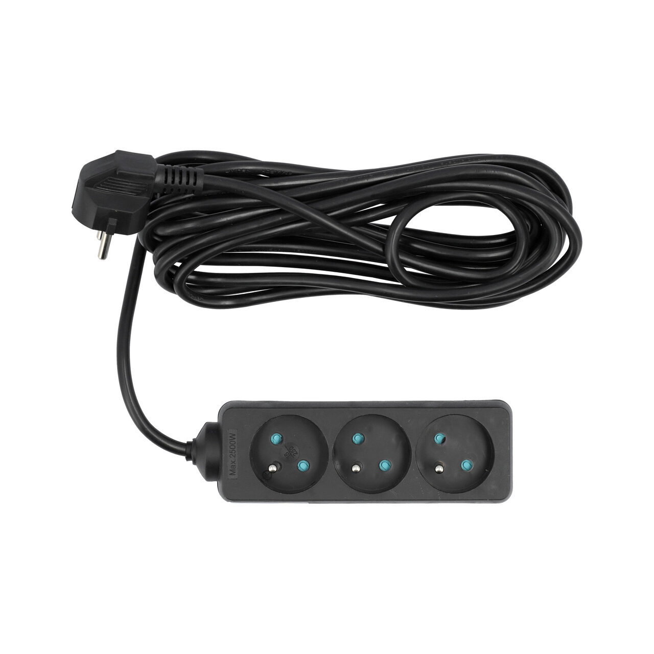 Prelungitor clasic cu 3 prize cu impamantare - tip francez. Cablu H05VV-F 3G1,0mm2. 5 m lungime. Carcasă din plastic. Culoare neagră.