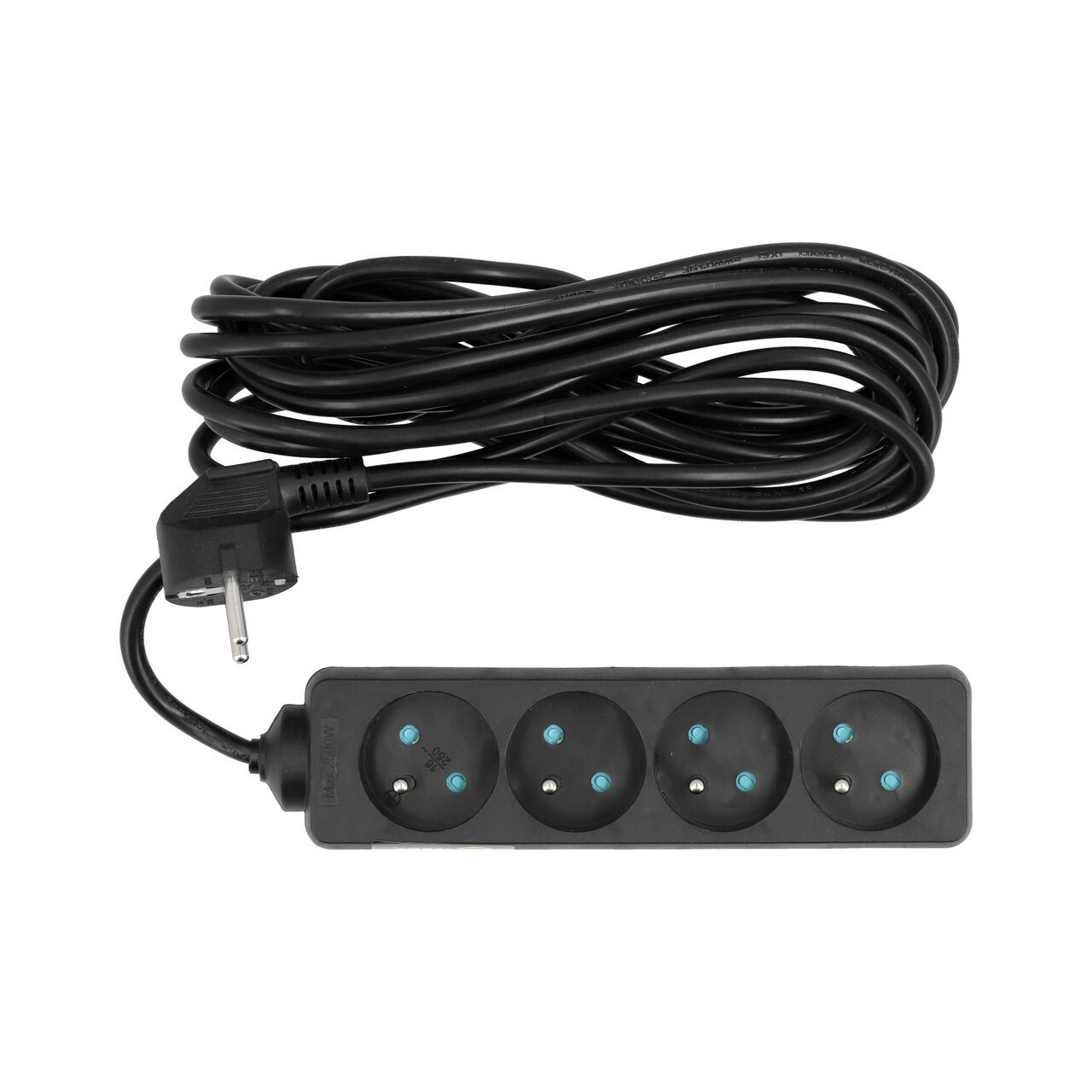 Prelungitor cu 4 prize. Carcasă cu priză din plastic, culoare neagră.