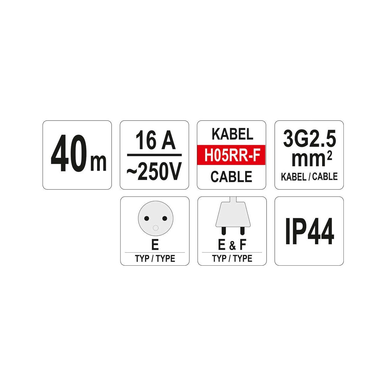 Caracteristici produsYT-8102 cablu prelungitor de construcție și atelier , lung de 40 de metri, cu priză rezistentă la praf și stropire. Cablul dintr-o manta din cauciuc natural face ca extensia să fie potrivită pentru utilizare în interior și exterior, de ex. Pe un șantier, într-o grădină, în fața șantierelor de producție. Secțiunea transversală a firelor individuale este de până la 2,5 mm², datorită căreia căderea de tensiune pe toată lungimea cablului prelungitor este minimă. Acest lucru permite alimentarea fără probleme a dispozitivelor care necesită curent mare, cum ar fi sudori invertoare, compresoare sau ferăstraie mari pentru lemn.