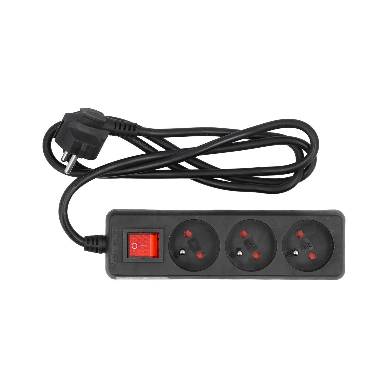 Prelungitor clasic cu comutator si 3 prize cu impamantare. Cablu H05VV-F 3G1,0mm2. 1,5 m lungime. Carcasă din plastic. Culoare neagră.