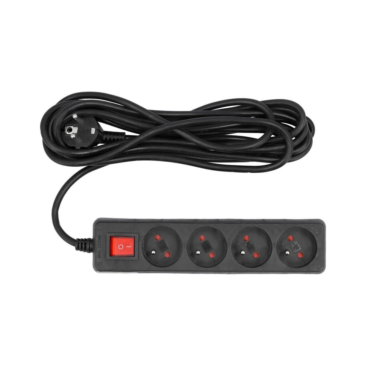 Un prelungitor clasic cu prize cu împământare și întrerupător de curent în toate prizele.