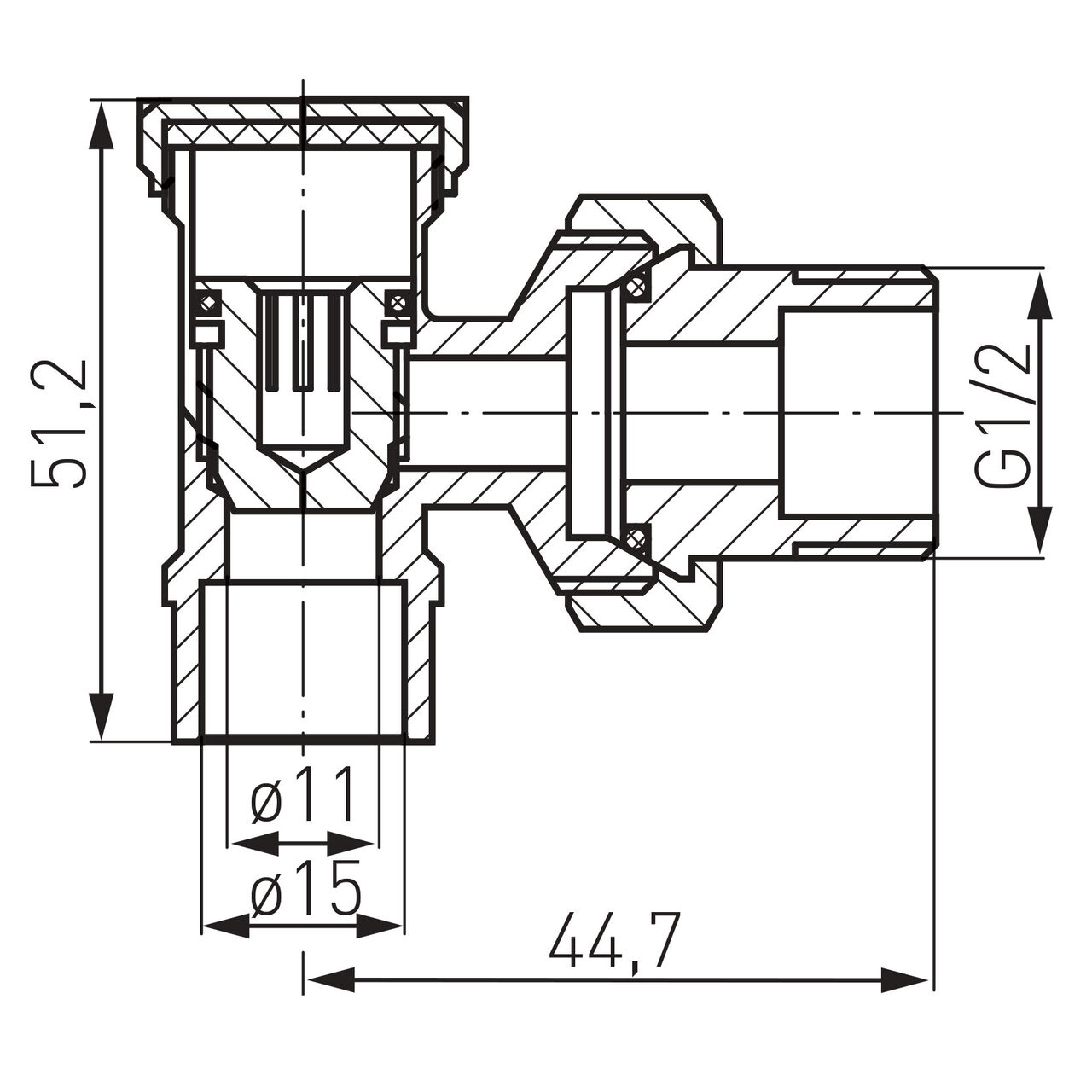 La radiator se conectează pe G1/2 (Dimensiune A), iar către conductă are racord de 15 mm pentru lipire, asigurând un traseu compact pe retur.