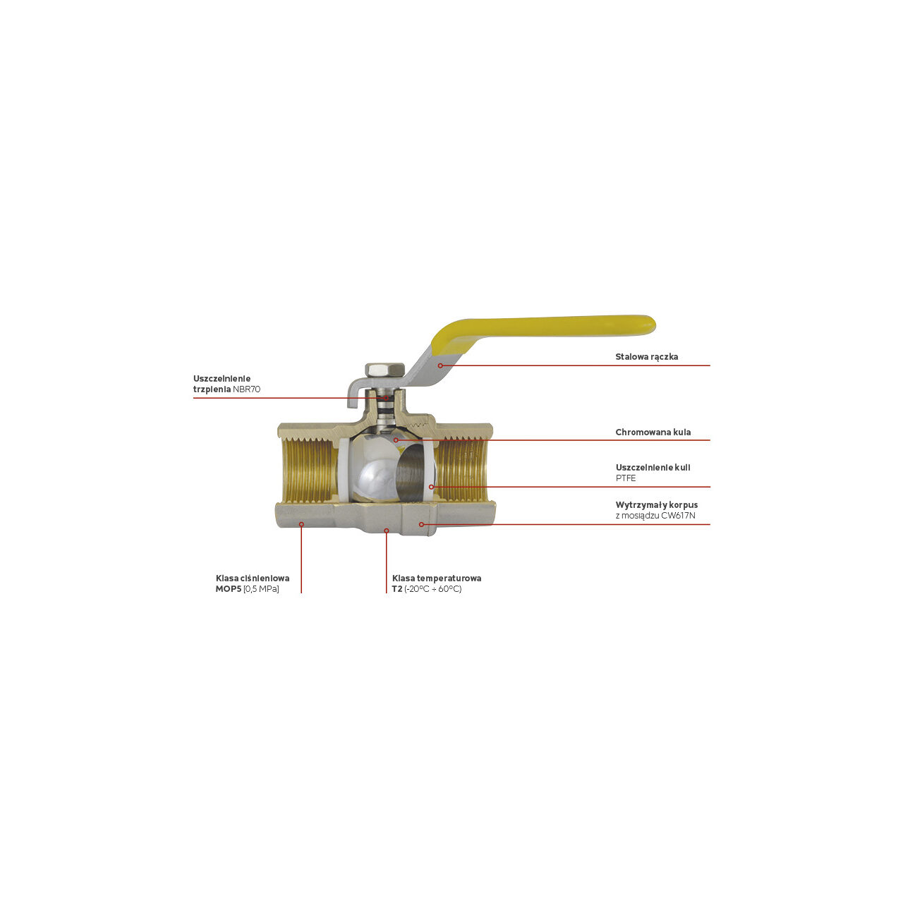 Controlul debitului de gaz se face simplu și previzibil cu robinetul cu bilă, conceput pentru conexiuni FI-FI de 3/4". Mecanismul intern folosește material de etanșare sferă din PTFE pentru o închidere constantă, iar o-ringurile duble NBR70 pe ax reduc riscul de pierderi în timp. Maneta permite o operare clară, în poziții deschis/închis, utilă la izolare rapidă. Corpul și sfera din alamă asigură o structură robustă pentru mediu de lucru gaz. Intervalul T2, între -20 și 60 °C, susține utilizarea în regimuri uzuale, iar presiunea nominală MOP5 (5 bar) oferă marjă pentru aplicații rezidențiale sau tehnice compatibile. Conexiunea FI-FI facilitează integrarea în trasee filetate existente, fără piese suplimentare de conversie. Pentru simplitate și siguranță operațională, produsul nu are aerisitor, nu include presetupă și nu integrează accesorii precum filtru sau duză de scurgere. Construcția cu bilă din alamă și etanșare PTFE minimizează frecarea și uzura la manevrare, menținând consistența la închidere și deschidere. Secțiunea de trecere totală: nu, aspect ce poate influența selecția în funcție de necesarul de debit. Intervalul de lucru specific pentru gaz și acționarea prin manetă susțin izolarea punctuală în lucrări de mentenanță sau exploatare curentă.