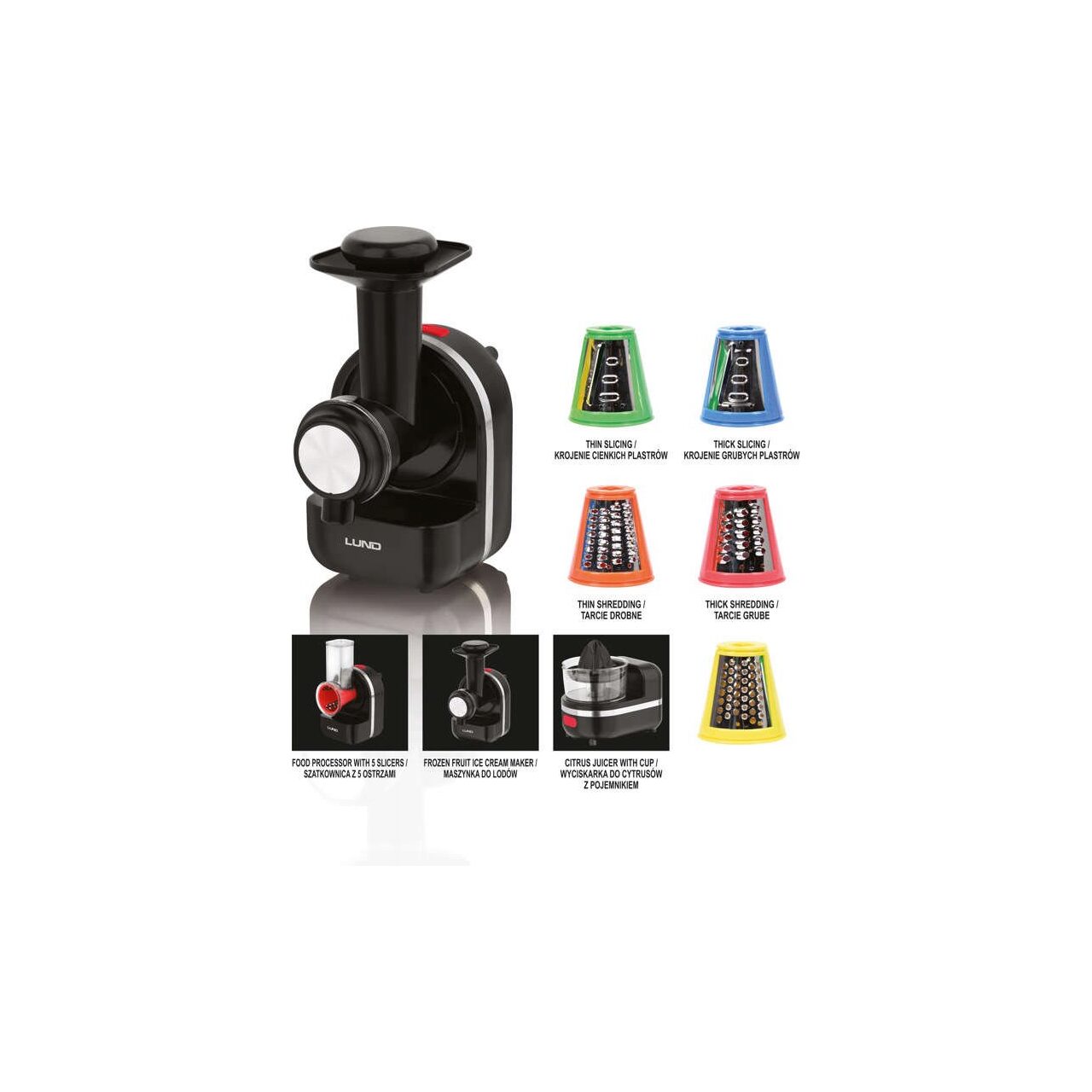 Mașina de feliat are până la 5 răzătoare înlocuibile care vă vor ajuta să pregătiți, printre altele, salate sau clătite de cartofi. Aparatul de înghețată va zdrobi și modela corect fructele congelate.